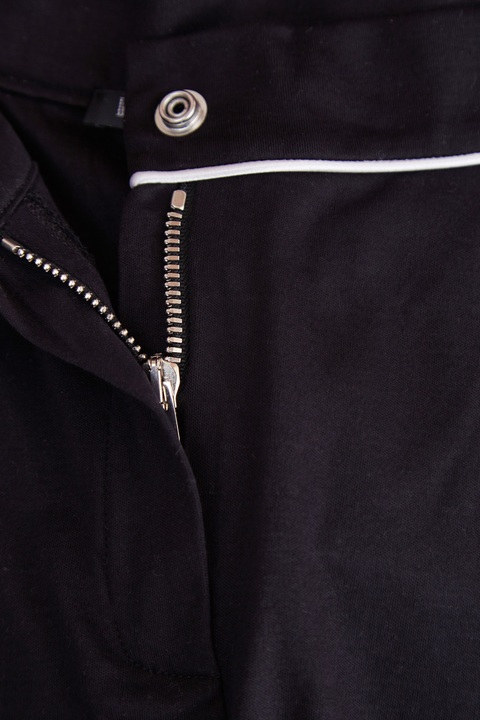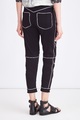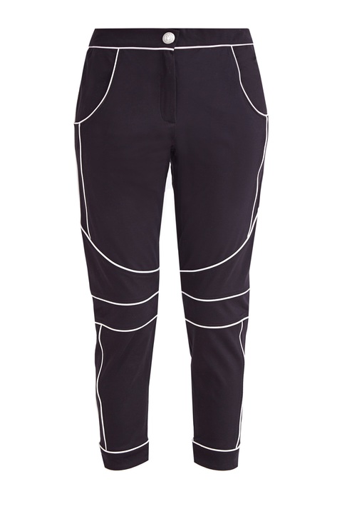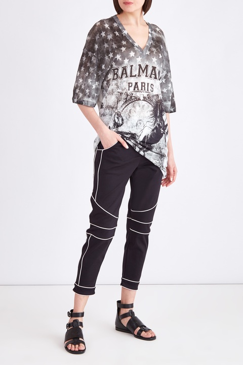 Эффектные женские брюки длины ⅞ слегка зауженного книзу силуэта из весенне-летней коллекции Balmain выполнены из дышащего хлопка базового черного тона. Все швы изделия подчеркнуты контрастной белой лентой, благодаря чему образ становится более динамичным. Комфортная посадка достигается за счет сложного кроя. Стандартная застежка на кнопку и молнию, а также два прорезных и два накладных кармана завершают изделие.