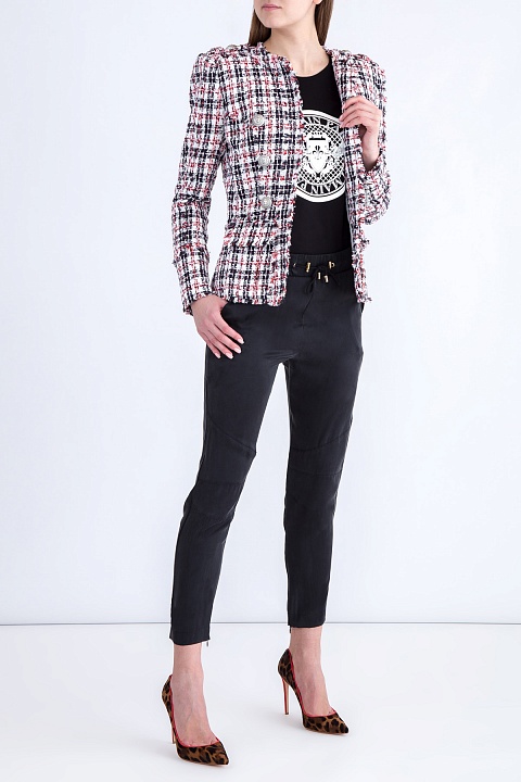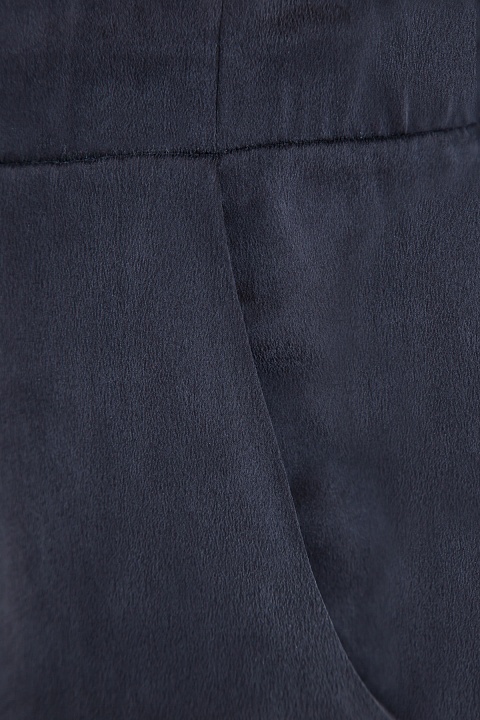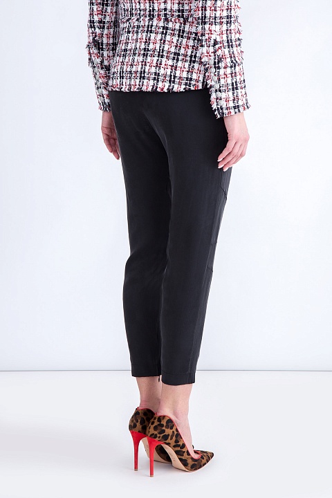 Женские зауженные книзу брюки длиной 7/8 из весенне-летней коллекции Balmain выполнены из струящегося шелка с бархатистой текстурой. Особенностью модели является оригинальный крой в области колен и потайные застежки-молнии на нижней кромке во внутренних швах брючин. Изделие свободного кроя оснащено двумя прорезными карманами на передних планках и широким эластичным поясом на кулиске, что вносит в образ нотку спортивного стиля.
