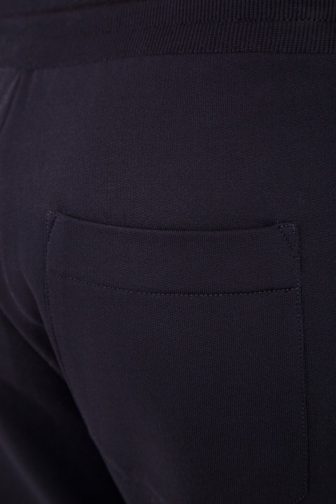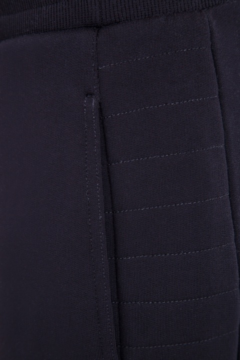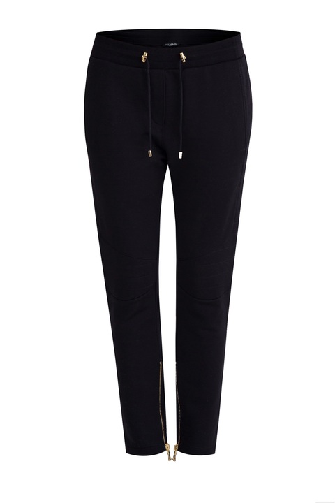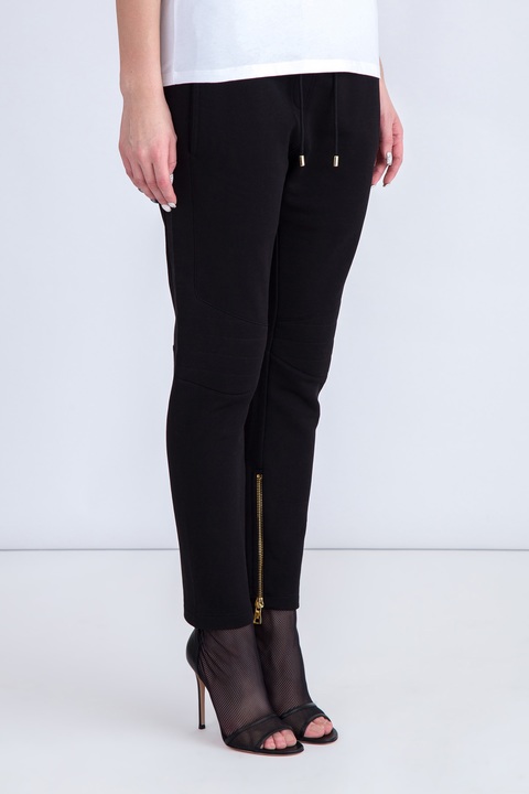 Женские брюки Balmain в спортивном стиле, выполненные из мягкого трикотажного хлопка черного цвета и дополненные простеганными вставками на боковых швах и коленях. Модель дополняют массивные молнии на кромках и фурнитура на поясе с регулировочными шнурками в золотом оттенке, подчеркивая стиль бренда.