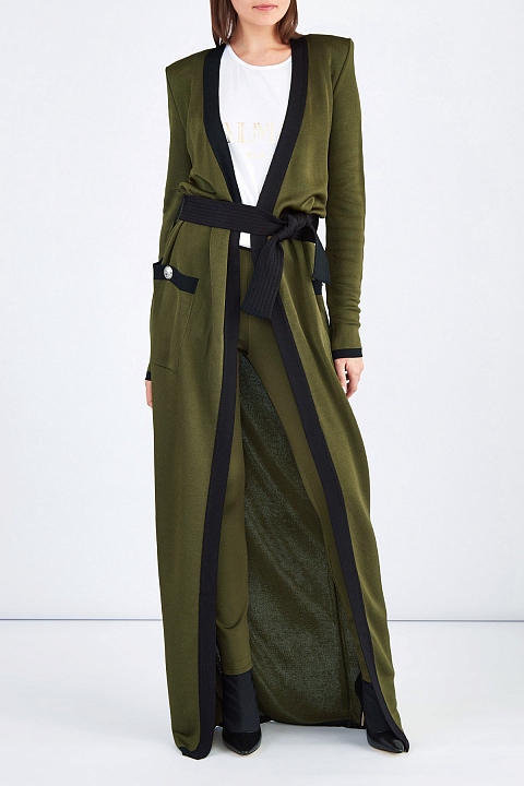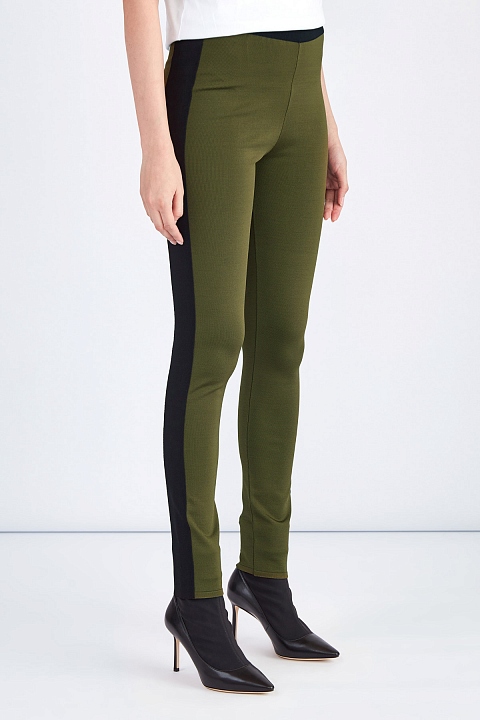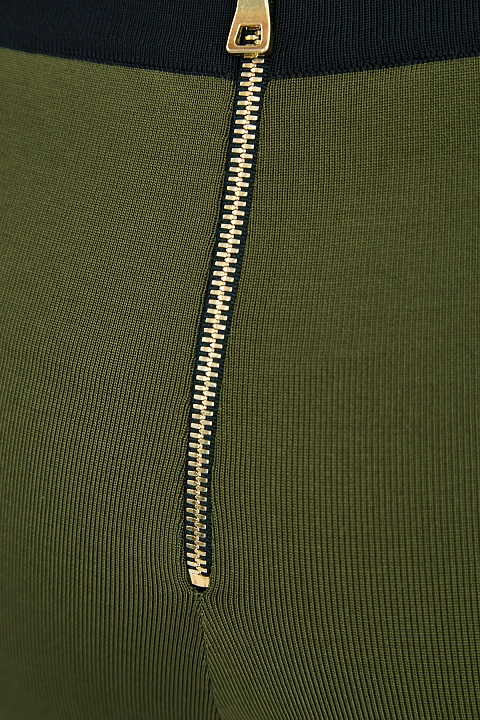 Стильные женские леггинсы из коллекции осень-зима от Balmain созданы из плотной вискозной пряжи в универсальном оттенке хаки. Цветовые акценты в образ вносит отделка элементами контрастного черного тона на притачном поясе и боковых швах-лампасах. Изделие дополнено массивной застежкой-молнией с золотистым напылением, расположенной в центральном шве спинки и подчеркивающей фирменный стиль.