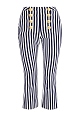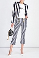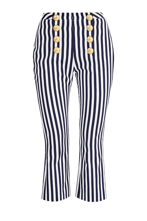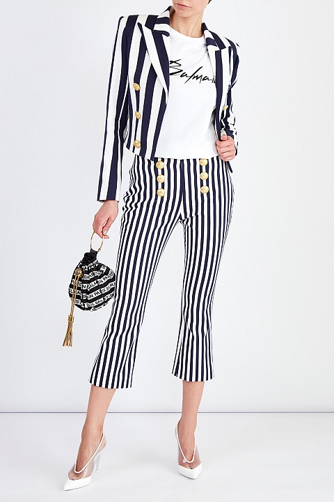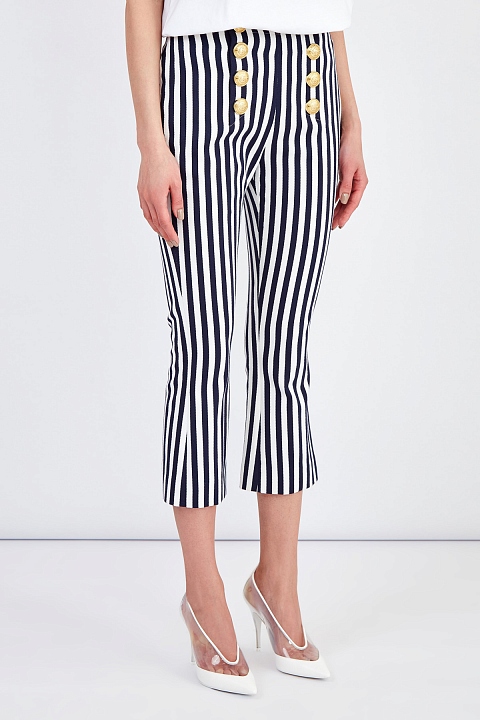 Эффектные брюки укороченного расклешенного кроя от Balmain выполнены из фактурного хлопка с принтом в полоску в морской гамме. Двубортная отделка с фирменными пуговицами с тисненым гербом Модного дома подчеркивает присущий Модному дому винтажный стиль. Детали: высокая посадка, облегающий фигуру силуэт.