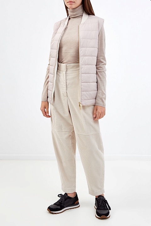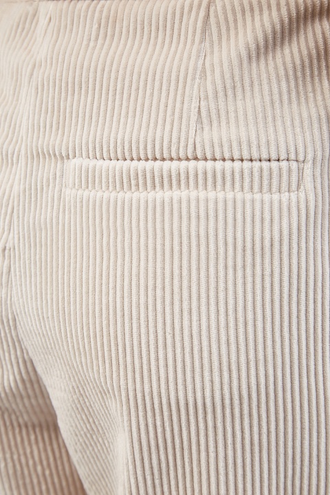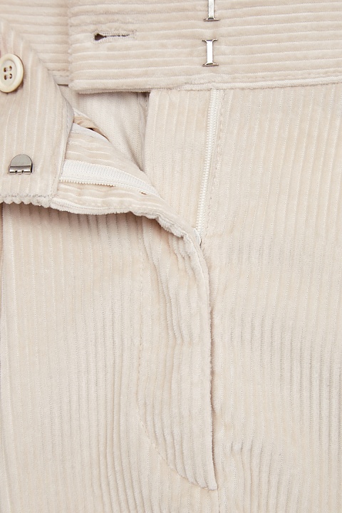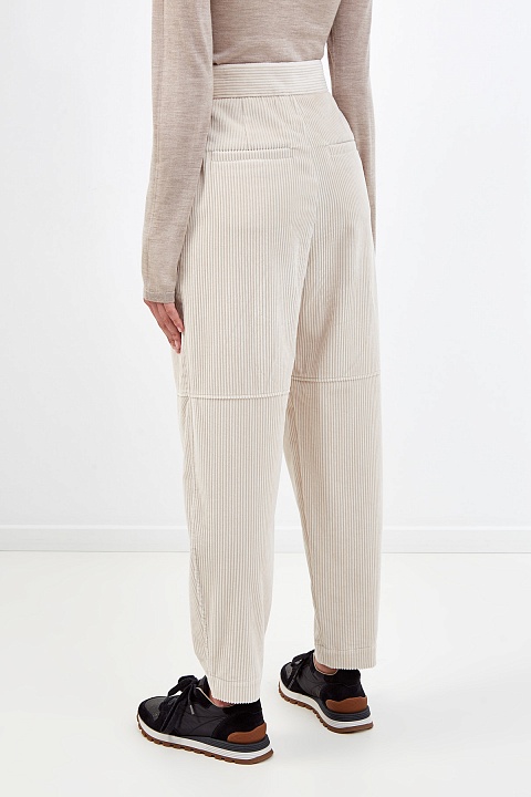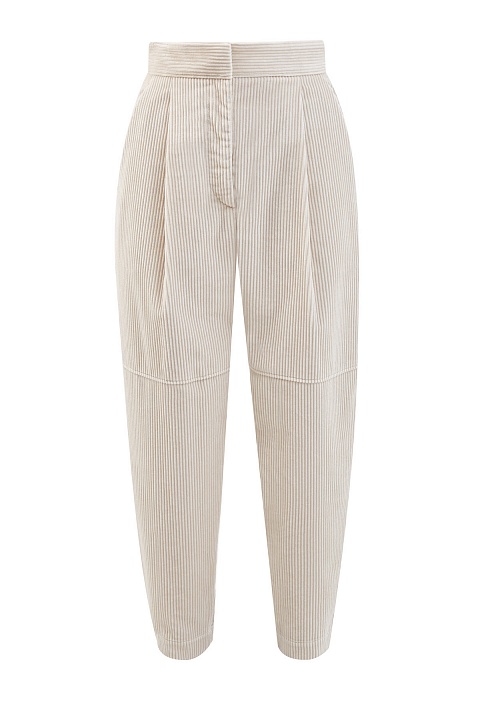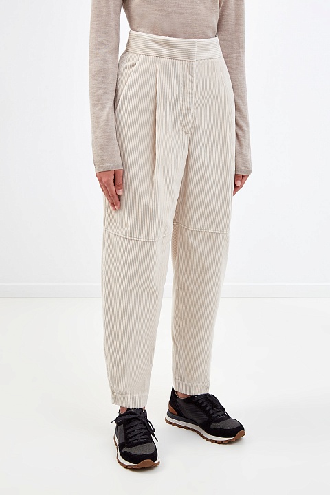 Женские брюки Barrel Leg от Brunello Cucinelli созданы из хлопкового вельвета в кремовом оттенке. Бархатистая текстура ткани подчеркивает плавные, объемные линии кроя, а фактурные швы дополняют образ чертами неформального стиля. Высокая посадка создает акцент на талии. Детали: прорезные карманы, заложенные складки от пояса, потайная застежка на пуговицу, крючки и молнию. Сделано в Италии.