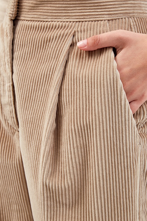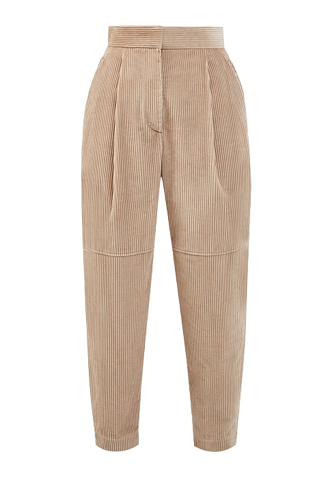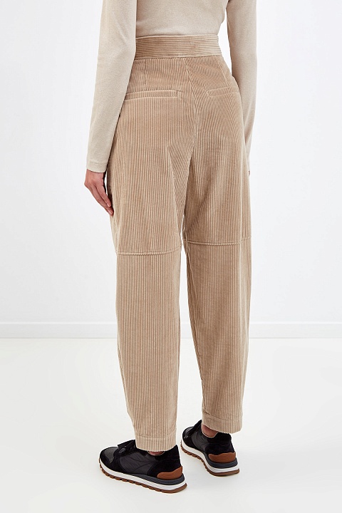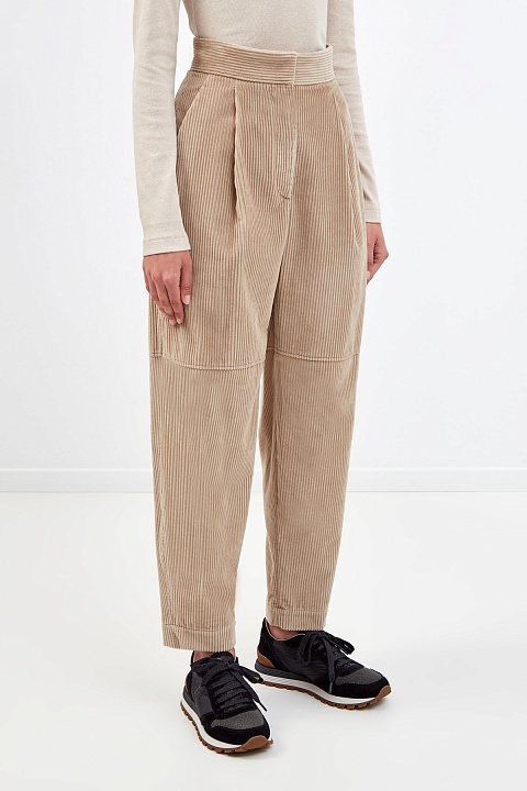 Брюки Barrel Leg от Brunello Cucinelli созданы из хлопкового вельвета. Бархатистая текстура ткани подчеркивает плавные, объемные линии кроя, а фактурные швы дополняют образ чертами неформального стиля. Высокая посадка создает акцент на талии. Детали: прорезные карманы, заложенные складки от пояса, потайная застежка на пуговицу, крючки и молнию. Сделано в Италии.