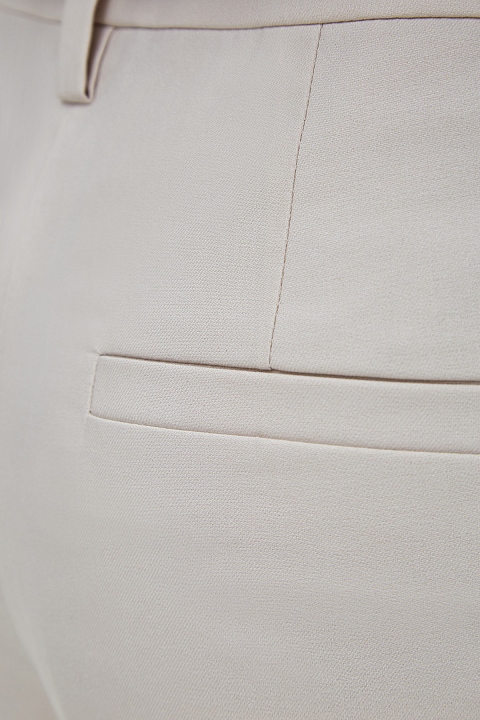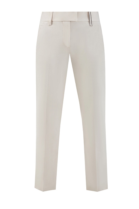 Укороченные брюки в классическом стиле от Brunello Cucinelli. Модель создана в универсальном оттенке слоновой кости из держащего форму хлопка — натуральная ткань с волокнами эластана обеспечивает комфорт в движении. Мерцающий акцент — выполненная вручную вышивка Мониль на петле для ремня. Карманы с бортами и потайная застежка придают образу строгость. Сделано в Италии.