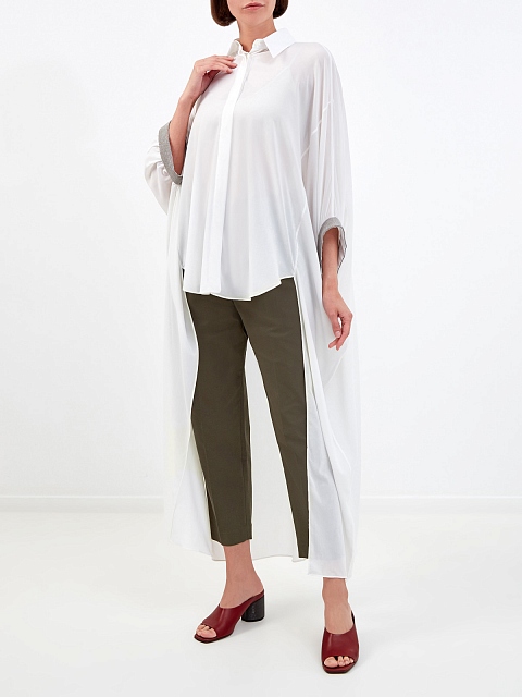 Элегантные женские брюки от Brunello Cucinelli выполнены из крученого хлопкового твила с добавлением эластичных волокон, благодаря которым ткань не стесняет движений. Модель на классической высокой посадке дополнена диагональными прорезными карманами на передних планках, а также потайной застежкой на молнию. Заложенные складки придают образу нотку неформального шика. Сделано в Италии.