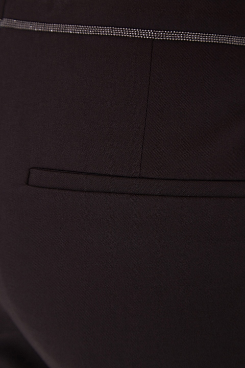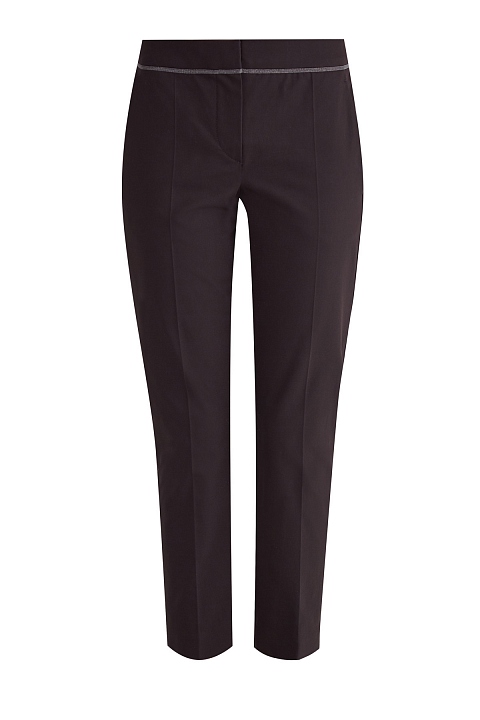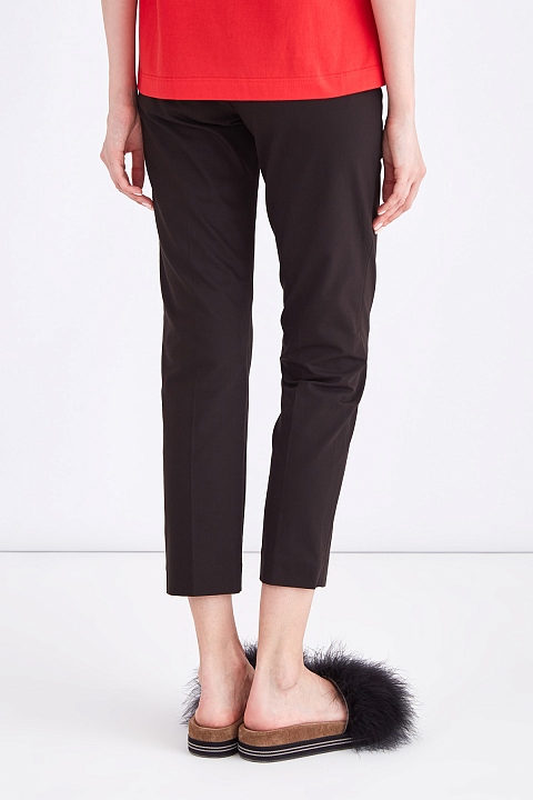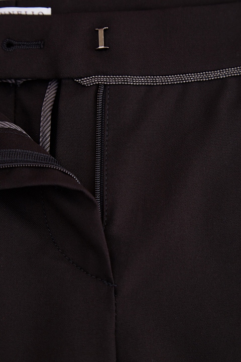 Брюки-дудочки Tailored Cigarette Brunello Cucinelli переосмысленные специально для весенне-летней коллекции и выполненные из тонкой смесового хлопка Tropical Luxury черного цвета. Этой укороченной модели характерны классические линии и детали в виде конструктивных стрелок, фронтальных французских и прорезных задних карманов, потайной застежки. Стиль бренда прослеживается в украшении Shiny Belt с бусинами «монили» на притачном поясе. Сделано в Италии.