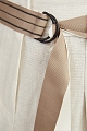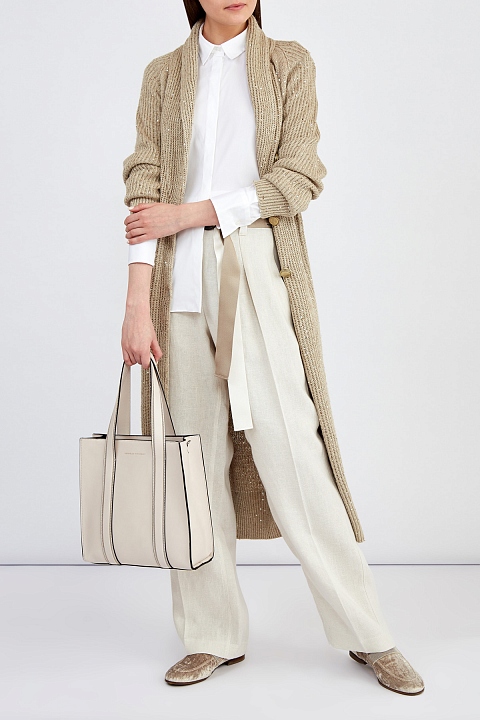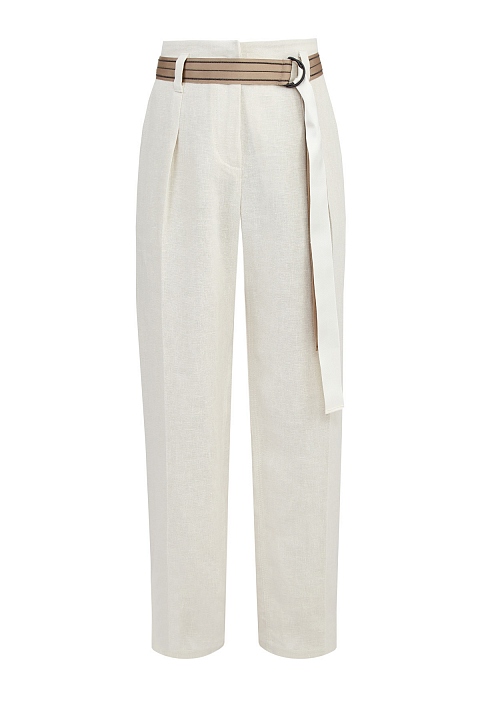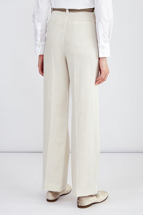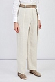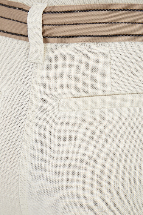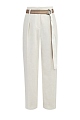 Широкие прямые брюки от Brunello Cucinelli созданы из льняной ткани со слегка неровной холщовой текстурой в натуральном рисово-белом оттенке. Модель на высокой посадке дополнена съемным широким поясом из грогрена с выполненной вручную отделкой цепочками Мониль и D-образными фиксаторами. Детали: заложенные складки, застежка на кнопки и молнию, прорезные карманы. Сделано в Италии.