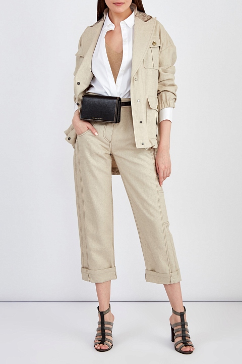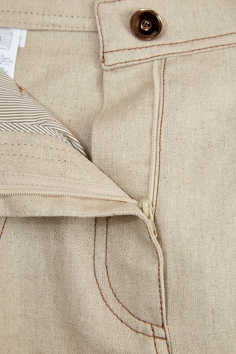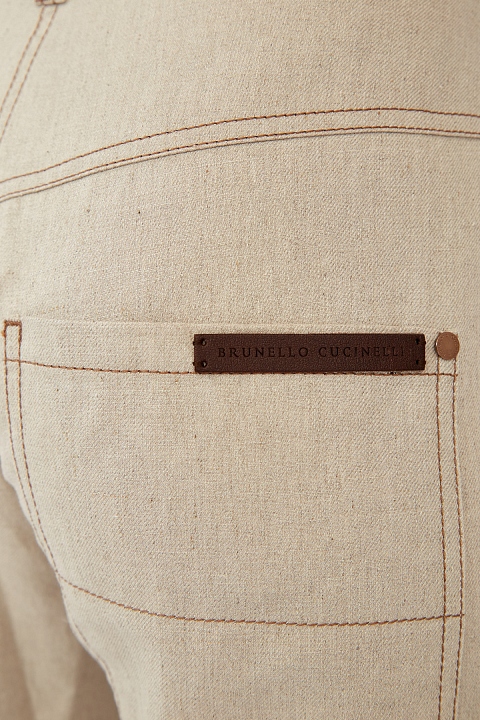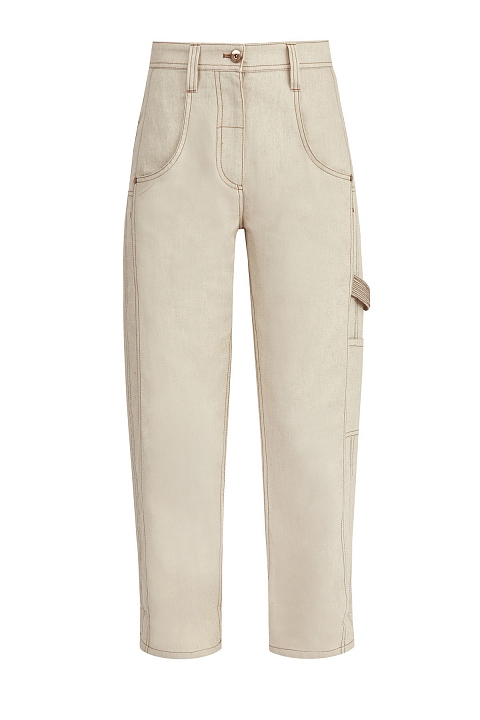 Брюки длины ⅞ от Brunello Cucinelli созданы из твила на основе льна и хлопка — легкая и дышащая ткань идеально подходит для летнего сезона. Модель на высокой посадке дополнена заниженным шаговым швом и объемным кроем брючин, которые формируют узнаваемый стиль карго. Образ завершает аутентичная деталь, вручную расшитая фирменным элементом — цепочкой Мониль. Детали: застежка на пуговицу и молнию, накладные карманы по бокам, контрастные швы. Сделано в Италии.