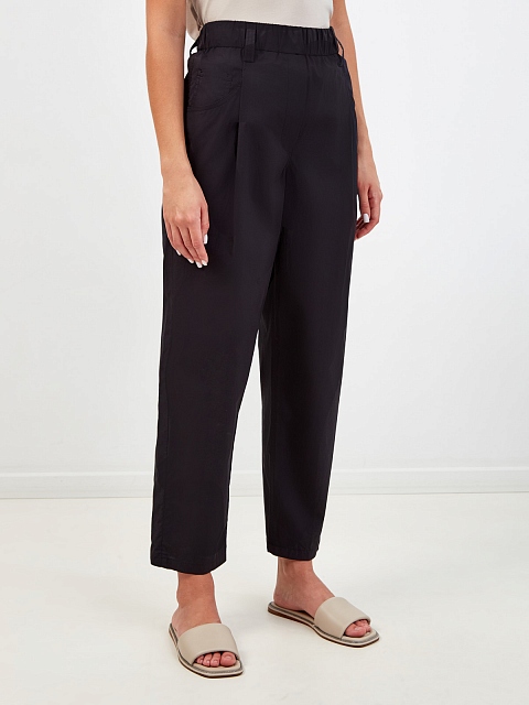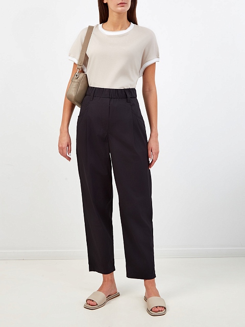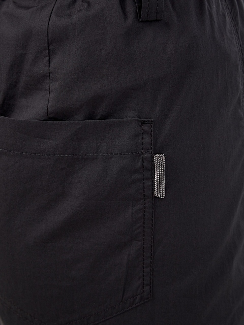 Брюки Baggy Track в изысканном и современном стиле от Brunello Cucinelli. Модель в универсальном черном цвете создана из тонкого хлопкового поплина. Гладкая ткань в сочетании с заложенными складками идеально подходит для создания повседневных образов. Мерцающий штрих — деталь из ювелирных бусин Мониль без содержания никеля на кармане. Сделано в Италии.