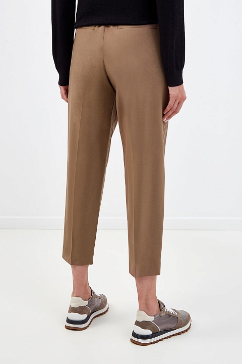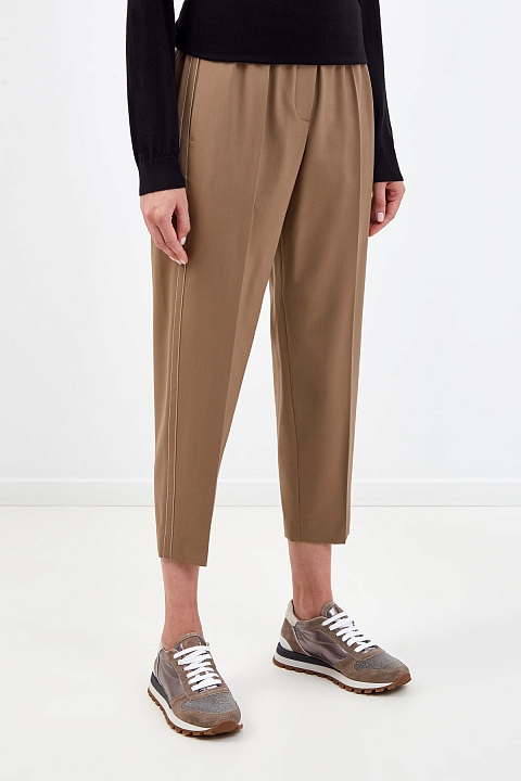 Женские брюки Baggy в расслабленном стиле от Brunello Cucinelli выполнены в теплом песочном оттенке. Натуральный материал на основе шерсти отличается гладкой и ровной фактурой. Невысокий процент синтетических волокон в составе обеспечивает максимальный комфорт в движении. Заложенные складки и фактурный эластичный пояс визуально моделируют силуэт. Детали: прорезные карманы, укороченный зауженный крой. Сделано в Италии.