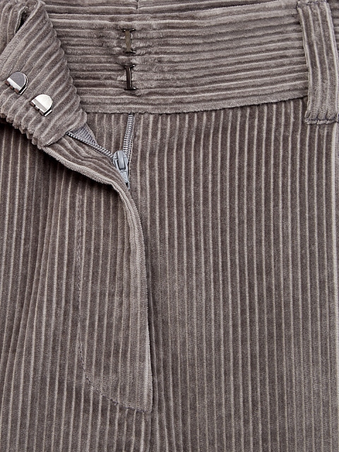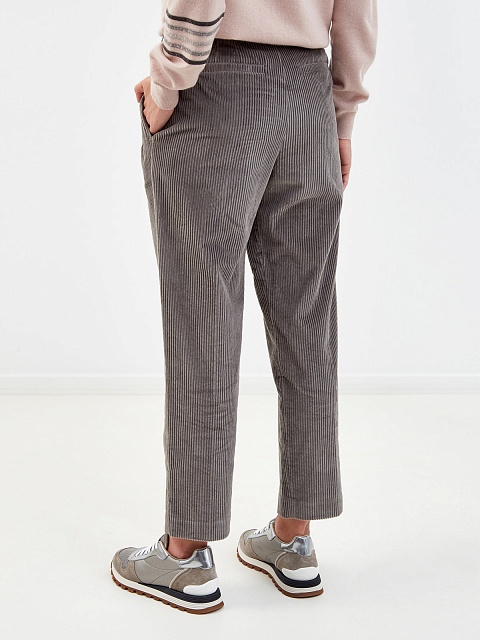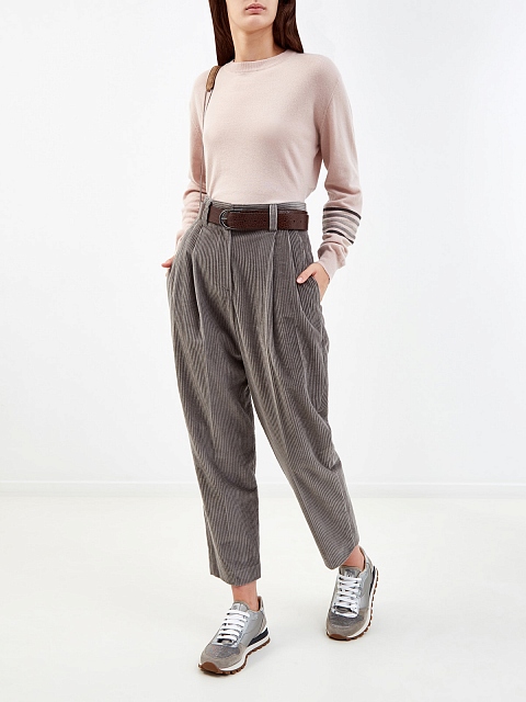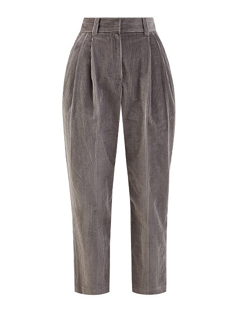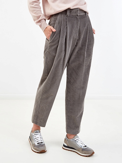 Элегантные брюки в расслабленном стиле от Brunello Cucinelli выполнены из мягкого хлопкового вельвета. Модель в пепельно-сером оттенке дополнена легкими заложенными складками от линии талии. Широкий притачной пояс и свободный силуэт обеспечивают максимальный комфорт в движении. Детали: три кармана, застежка на молнию и крючки. Сделано в Италии.