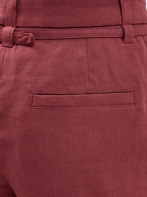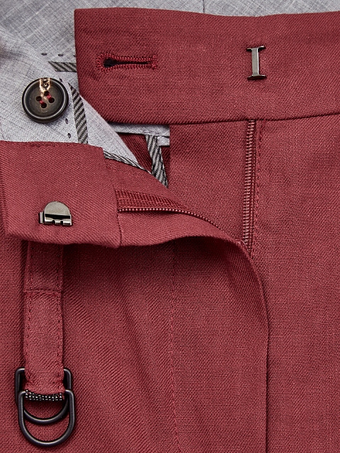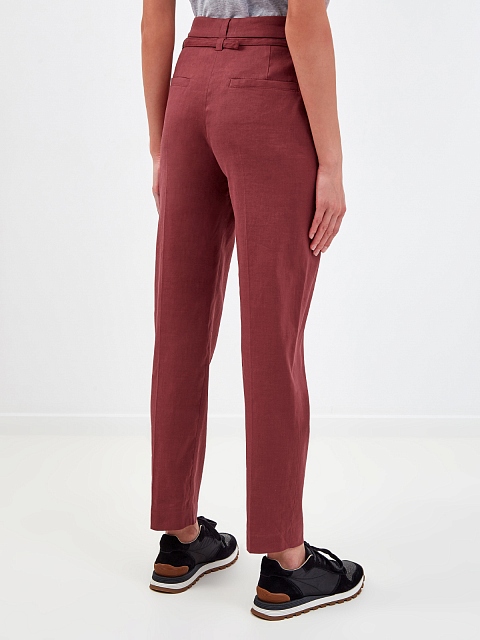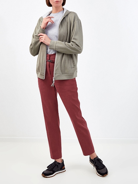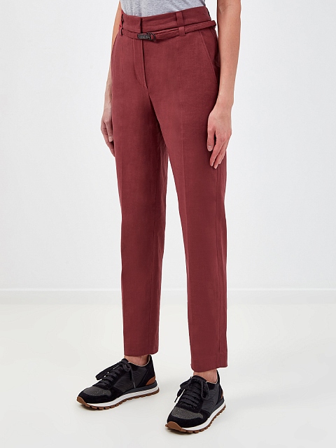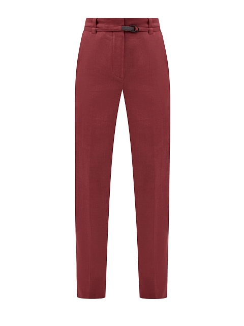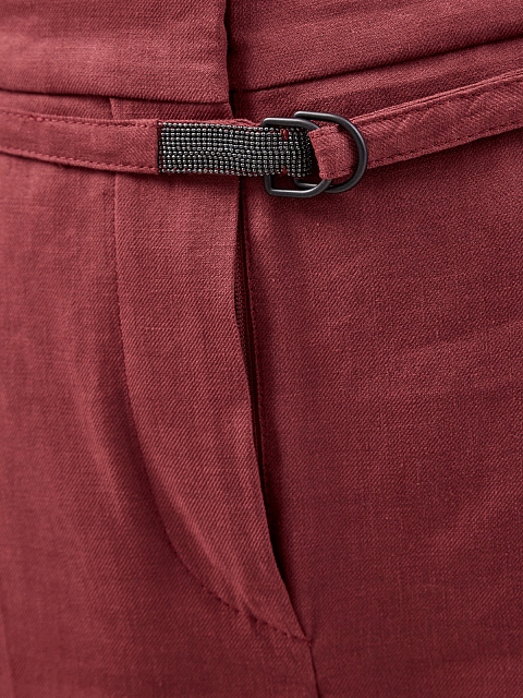 Женские брюки Loose Cigarette от Brunello Cucinelli созданы из легкой саржи в насыщенном винном оттенке. Минималистичный крой подчеркивает плотная фактура ткани из льна и хлопка, волокна эластана в составе препятствуют износу. Тонкий ремень с D-образными фиксаторами дополнен изысканной вышивкой бусинами Мониль. Детали: застежка на молнию и крючки, прорезные карманы. Сделано в Италии.