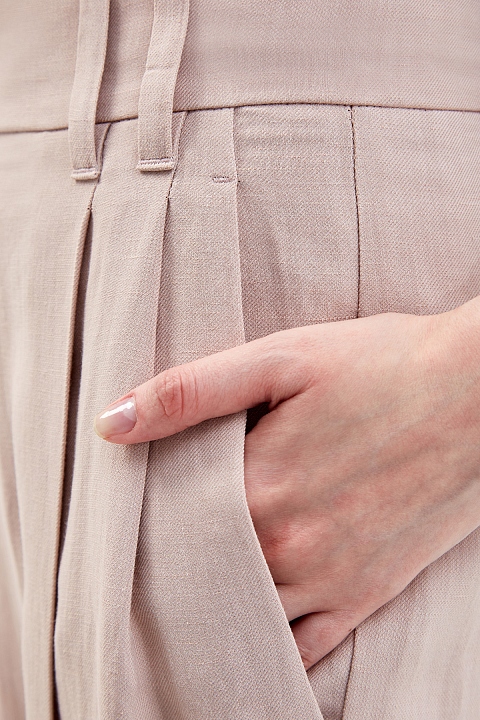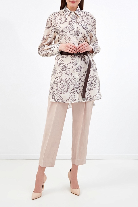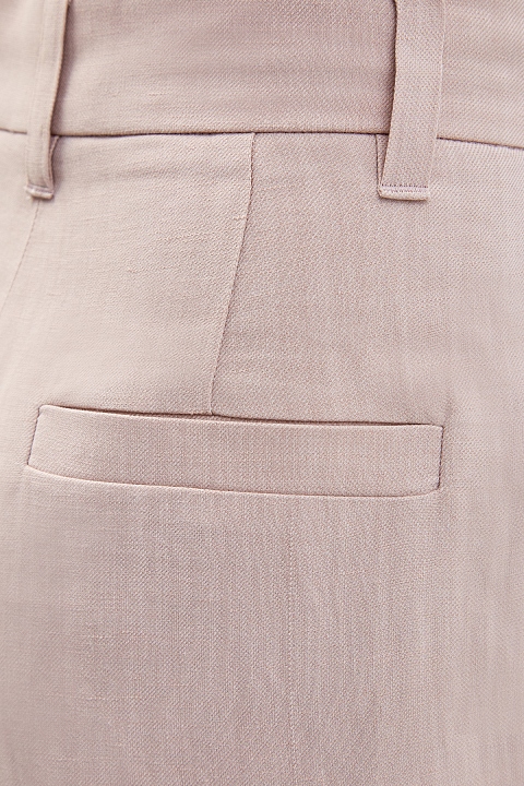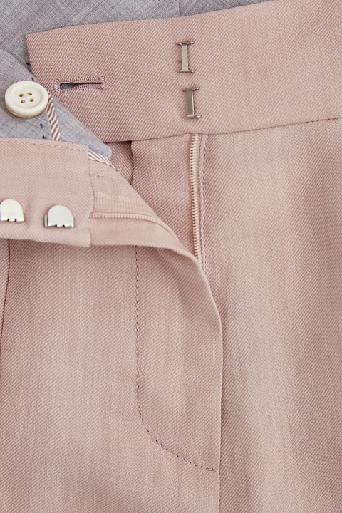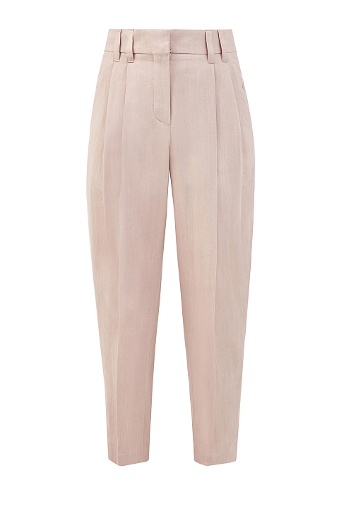 Брюки на высокой посадке от Brunello Cucinelli выполнены из фактурного твила Fluid — держащей форму ткани с характерным диагональным плетением. Льняная нить в составе придает поверхности неоднородный эффект. Комфортный, слегка зауженный книзу крой с вытачками обеспечивает свободу движений и точную посадку по фигуре. Детали: заложенные складки, четыре кармана. Сделано в Италии.