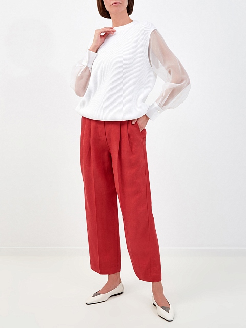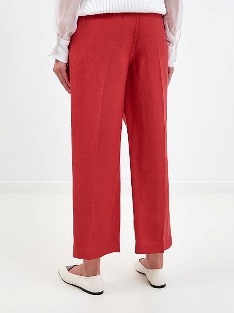 Широкие брюки от Brunello Cucinelli полностью созданы из натурального льна со слегка неоднородной холщовой текстурой. Модель в насыщенном алом оттенке дополнена заложенными складками от линии талии. Изысканный штрих — вышивка ювелирными бусинами Мониль вдоль шлевки на спинке. Детали: застежка на молнию и крючки, прорезные карманы. Сделано в Италии.