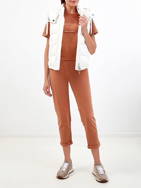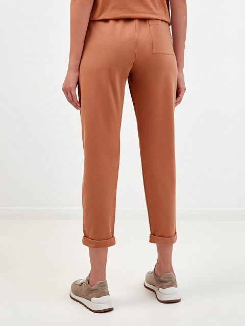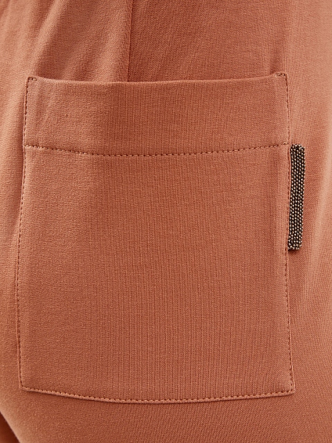 Комфортные брюки в сезонном оттенке от Brunello Cucinelli. Модель из коллекции для путешествий и активного отдыха Travelwear выполнена из мягкого хлопкового футера с добавлением волокон эластана. Вставка из ювелирных бусин Мониль на заднем кармане придает изделию изысканный штрих. Детали: пояс на кулиске, манжеты с отворотами. Сделано в Италии.