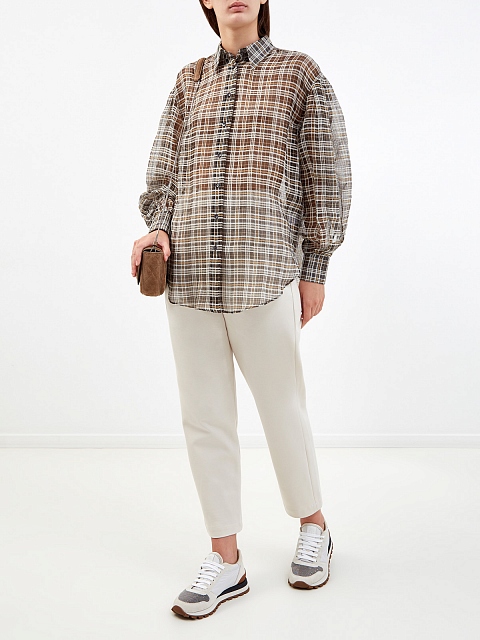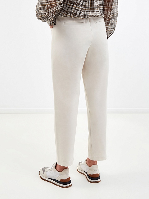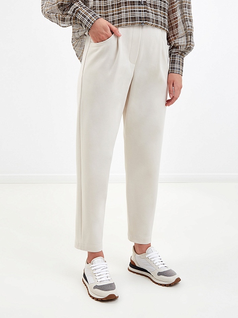 Минималистичные женские брюки от Brunello Cucinelli выполнены из хлопкового твила с добавлением эластичных волокон, благодаря которым ткань не стесняет движений. Модель на классической высокой посадке дополнена диагональными прорезными карманами на передних планках, заложенные складки придают образу нотку неформального шика. Сделано в Италии.