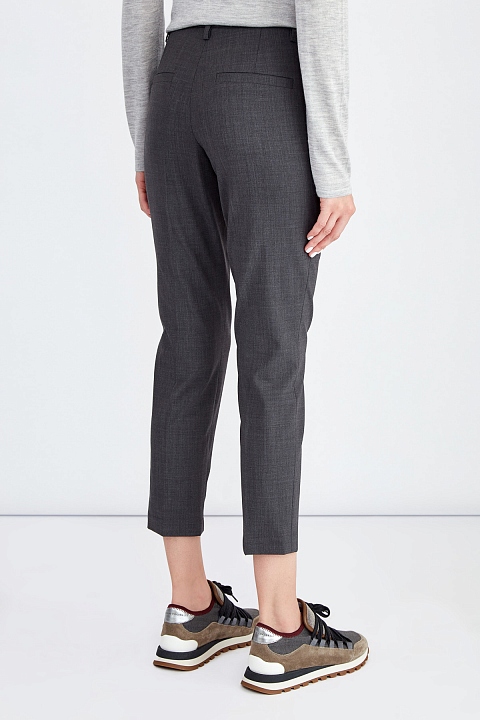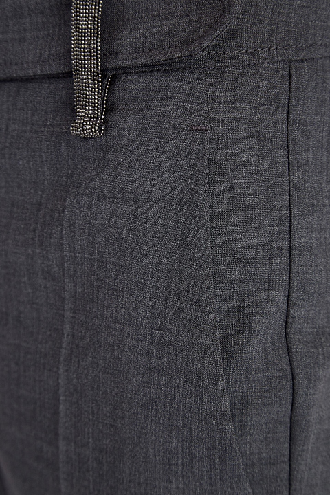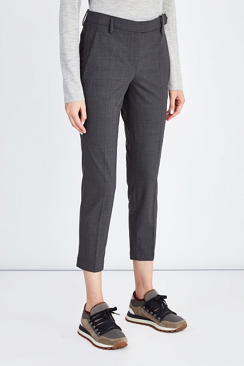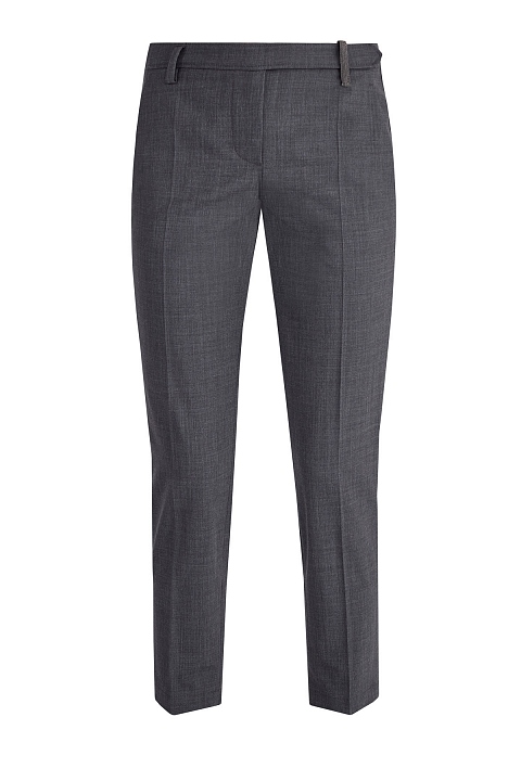 Графитовые брюки Boy Fit Cigarette от Brunello Cucinelli созданы из габардина Couture. Шерстяная нить делает материал гладким и легким. Модель дополнена притачным поясом с лямками для ремня. Шлевка, вышитая тонкими рядами блестящей цепочки Мониль, украшает аксессуар культовым декором бренда. Детали: прорезные карманы, застежка на потайной крючок, пуговицу и молнию. Сделано в Италии.