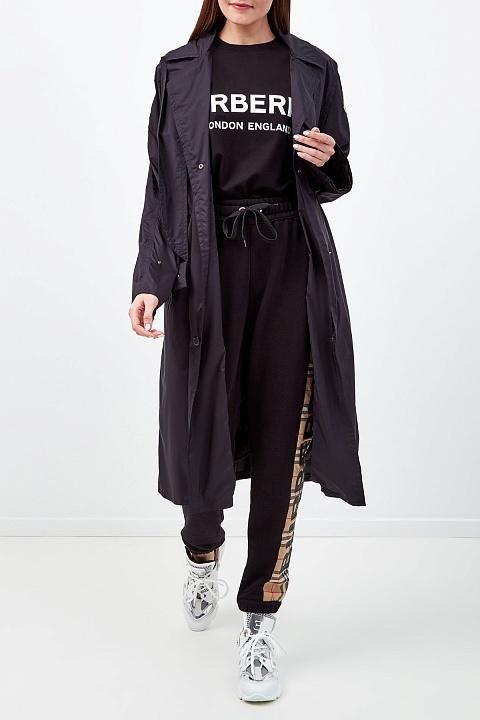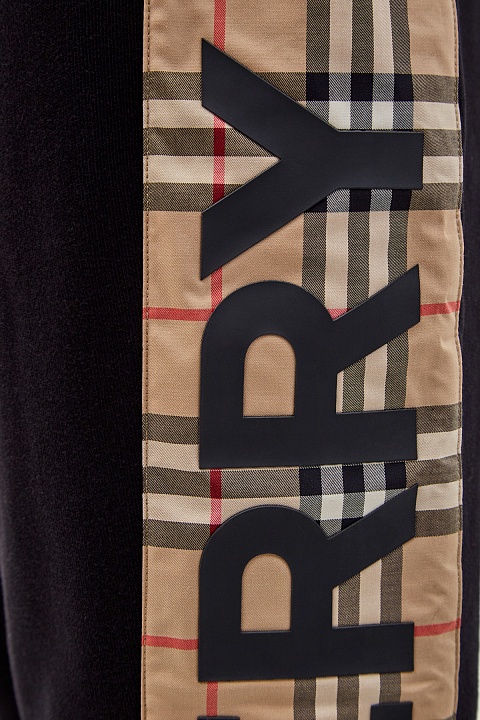 Спортивные брюки-джоггеры от Burberry выполнены из плотного хлопкового футера с фактурной внутренней поверхностью. Дышащая и эластичная ткань идеально подходит для путешествий и активного отдыха. Особенностью модели стала контрастная отделка в клетку с монограммой бренда в технике аппликации. Детали: эластичная отделка манжет, прорезные карманы, пояс на кулиске.