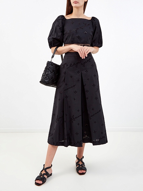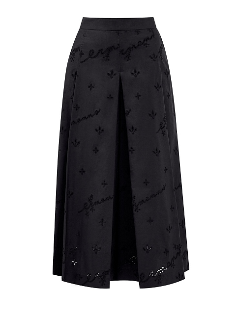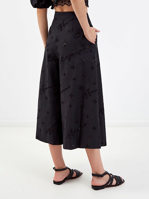 Свободные кюлоты укороченного кроя от Ermanno Firenze созданы в черном цвете. Модель из легкой хлопковой ткани с ажурным декором дополнена высоким поясом и потайной застежкой на молнию для идеальной посадки по фигуре. Прорезные карманы делают повседневные образы еще более комфортными.