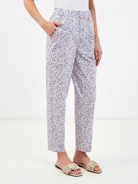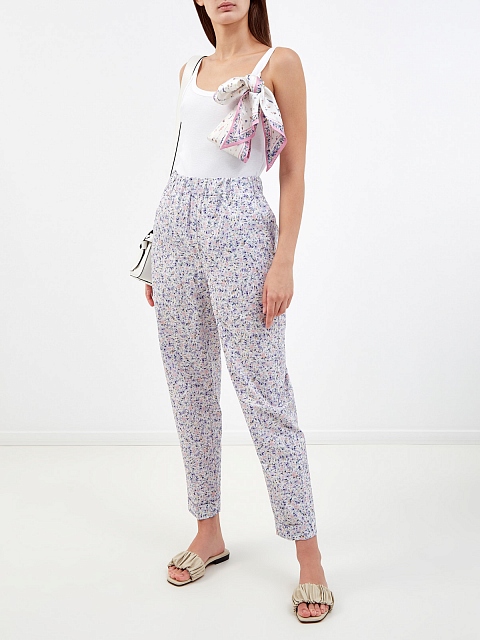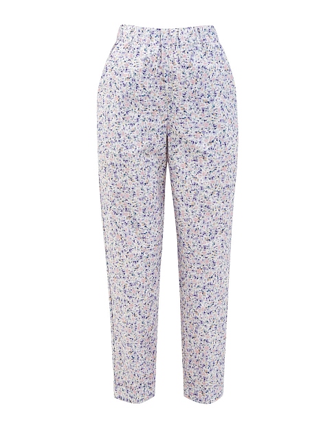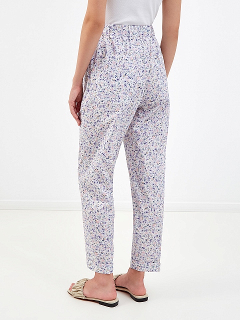 Брюки слегка зауженного кроя от Ermanno Firenze созданы из дышащего хлопкового поплина. Завышенная линия талии формирует гармоничные пропорции, флористический паттерн в пастельных тонах подчеркивает расслабленный стиль модели. Детали: прорезные и накладные карманы, эластичный пояс, широкие отвороты.