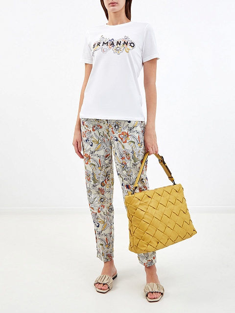 Легкие женские брюки от Ermanno Firenze созданы из дышащей хлопковой ткани. Завышенная линия талии формирует гармоничные пропорции, флористический паттерн и широкие отвороты подчеркивают расслабленный стиль изделия. Детали: прорезные и накладные карманы, эластичный пояс.