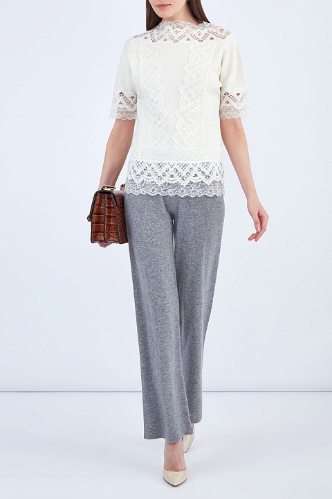 Укороченные женские брюки расслабленного расклешенного от колена силуэта от Ermanno Scervino полностью выполнены из тонкой кашемировой пряжи меланжевого серого оттенка. Лаконичный дизайн и комфортный крой делают модель идеальным дополнением для аутфитов в расслабленном стиле. Посадка по фигуре достигается за счет эластичного пояса. Сделано в Италии.
