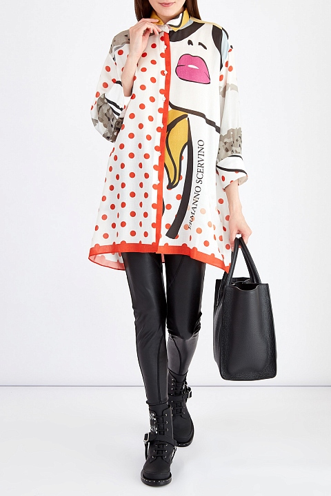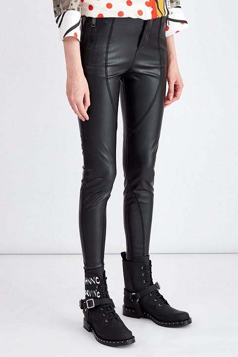 Леггинсы в байкерском стиле от Ermanno Scervino выполнены из гибкой ткани с мелкозернистой кожаной фактурой. Модель на высокой посадке дополнена прорезными карманами с массивными молниями, а также объемными швами. Крой с эффектом моделирования силуэта предусматривает широкие простроченные лампасы и фигурные линии. Детали: укороченная длина, застежка-молния, внутренняя тканевая отделка. Сделано в Италии.