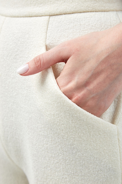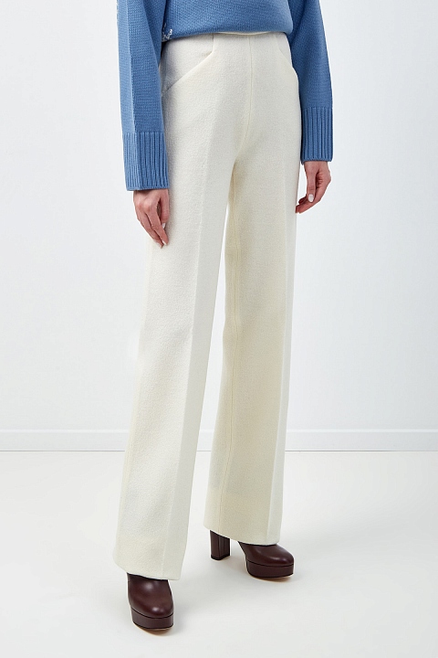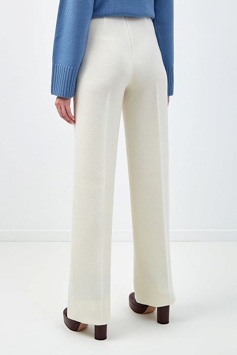 Элегантные брюки-палаццо от Ermanno Scervino выполнены из шерсти и кашемира в молочно-белом оттенке. Фактурная ткань приобретает мягкий жемчужный блеск за счет волокон шелка в составе. Стильный акцент — геометрический крой карманов. Вытачки обеспечивают точную посадку по фигуре. Детали: застежка на потайную молнию на спинке, высокая посадка, широкий пояс. Сделано в Италии.