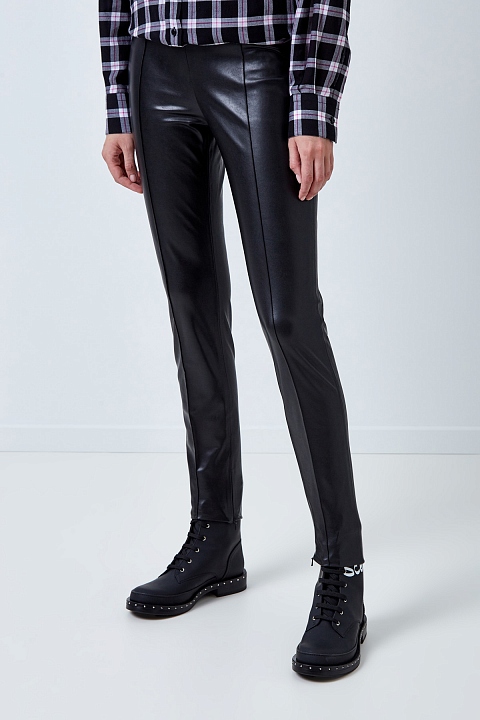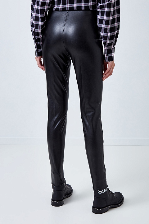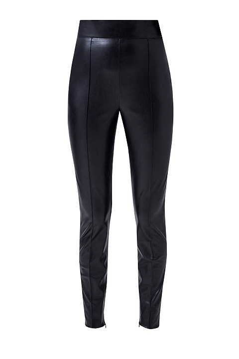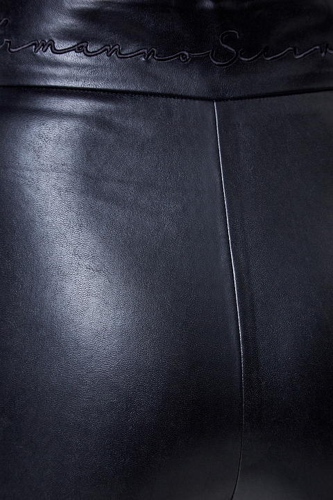 Эффектные леггинсы на высокой талии от Ermanno Scervino с эффектом кожаной поверхности. Модель на высокой талии дополнена широким притачным поясом с монограммой бренда на спинке. Простроченные стрелки делают образ более строгим, а застежки-молнии по низу вносят в образ нотку байкерского стиля. Внутренняя текстильная отделка обеспечивает максимальный комфорт. Детали: вытачки для посадки по фигуре, потайная молния в боковом шве. Сделано в Италии.