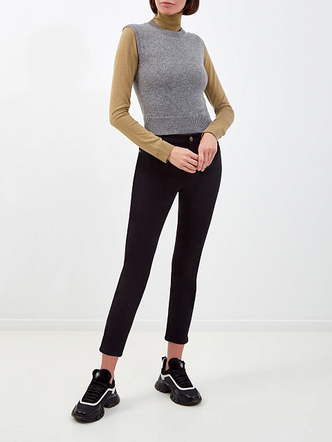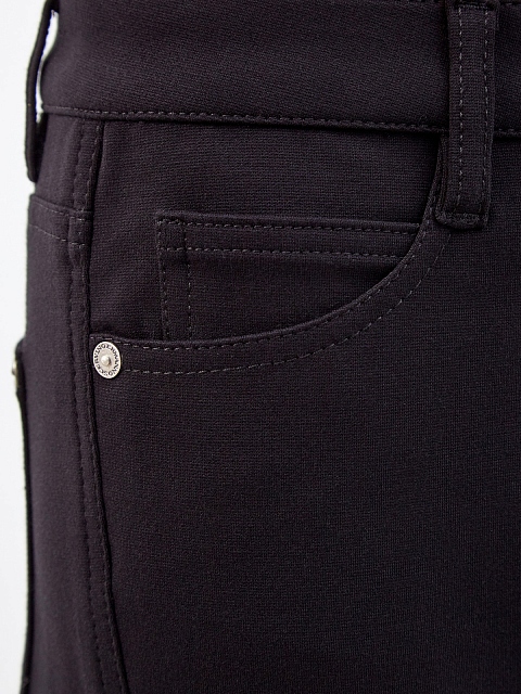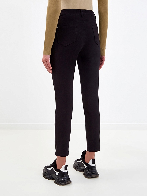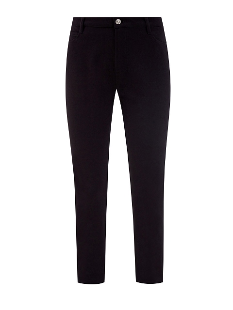 Однотонные женские брюки облегающего кроя от Ermanno Scervino выполнены в универсальном черном цвете. Модель из плотного матового материала на основе эластичных волокон вискозы повторяет движения тела и идеально подходит для создания повседневных образов. Фирменный штрих — фактурная вышивка на спинке изделия. Детали: застежка молнию и брендированную кнопку, пять карманов. Сделано в Италии.