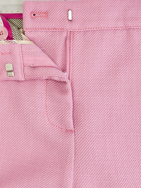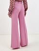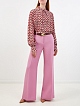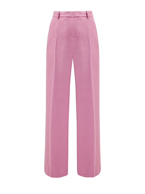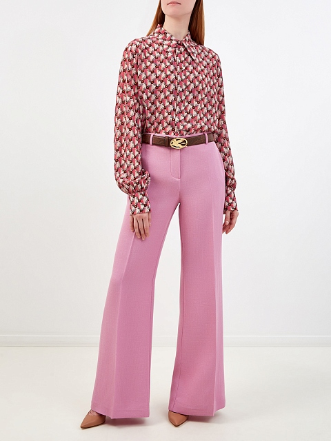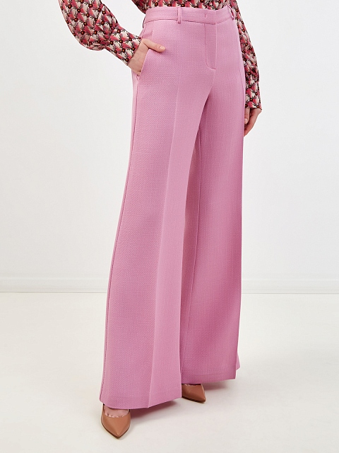 Стильные женские брюки расклешенного кроя от Etro выполнены из тонкой шерстяной ткани с древесными волокнами вискозы в составе. Нотку стиля эпохи 90-х модели придает высокая посадка и заложенные складки от линии талии. Изделие в актуальном пастельно-розовом оттенке дополнено шлевками для ремня и прорезными боковыми карманами. Сделано в Италии.