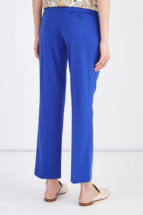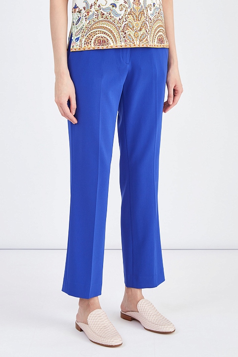 Яркие брюки укороченного прямого кроя от Etro созданы в синем оттенке из дышащей струящейся синтетической ткани. Модель идеально подходит для создания эффектных образов в поездках благодаря устойчивому к образованию складок составу. Детали: притачной пояс с петлями для ремня, вытачки для посадки по фигуре, прорезные диагональные карманы спереди и карман с бортами и пуговицей на спинке. Сделано в Италии.