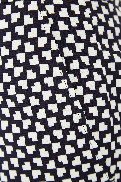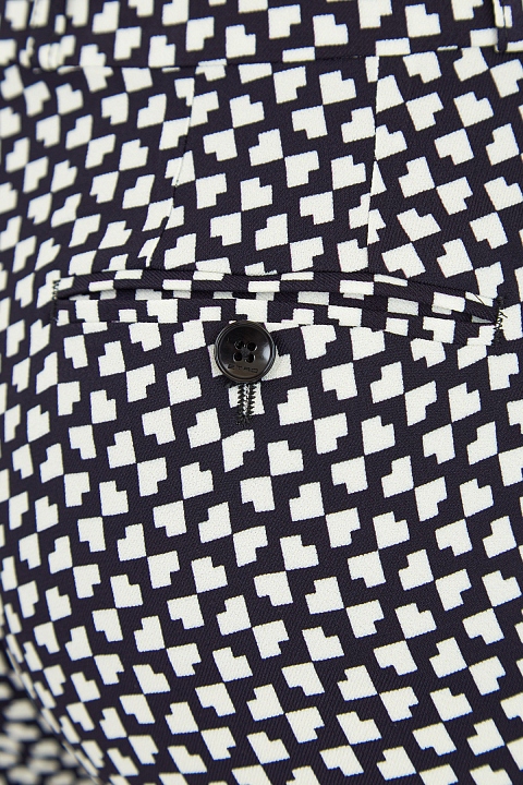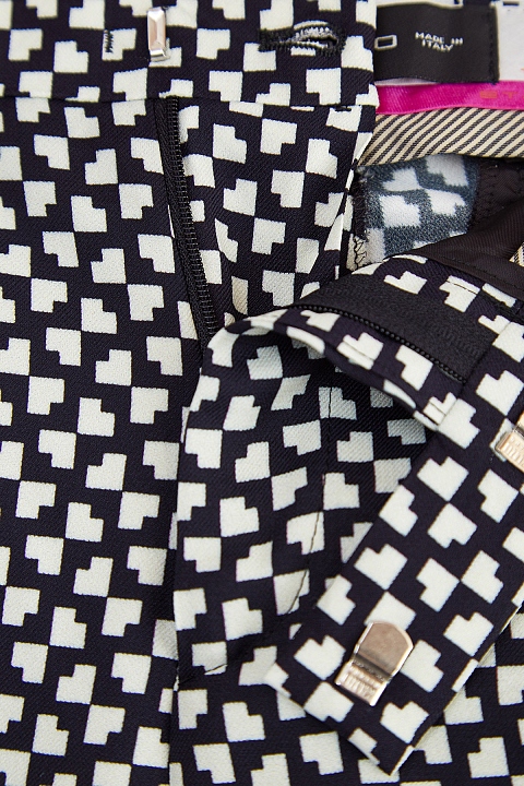 Яркие женские брюки кроя палаццо из весенне-летней коллекции Etro созданы из дышащего хлопка в монохромной черно-белой гамме с набивным геометрическим принтом. Модель на высокой посадке дополнена притачным поясом с петлями для ремня и асимметричной застежкой в неаполитанском стиле на металлический крючок, пуговицу и молнию. Передние планки оснащены прорезными карманами, а карман на спинке дополнен тонкими бортами и застежкой. Сделано в Италии.