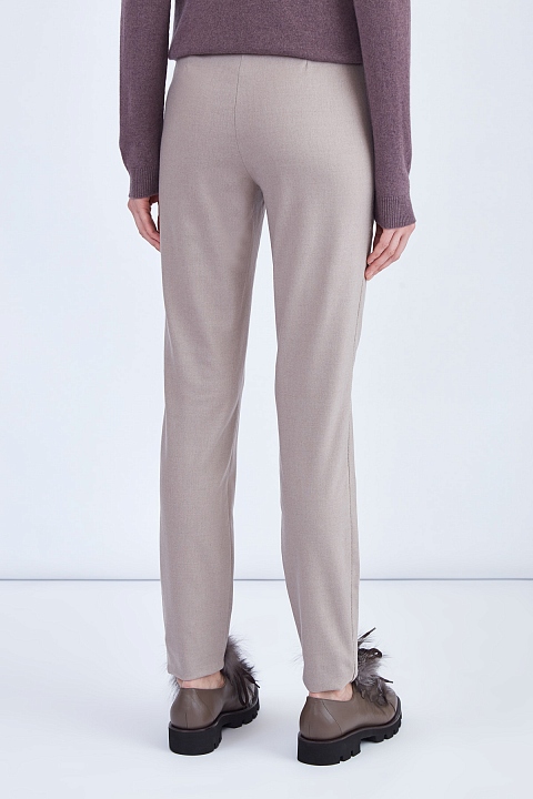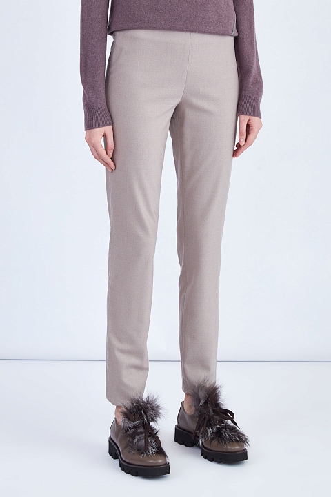 Лаконичные брюки на высокой посадке кроя slim от Fabiana Filippi созданы из тонкой неэластичной шерстяной ткани сливочно-бежевого оттенка. Волокна кашемира в составе придают материалу деликатный блеск по поверхности. Боковые швы декорированы фирменной цепью ювелирной огранки, а нижние кромки дополнены потайными молниями. Сделано в Италии.