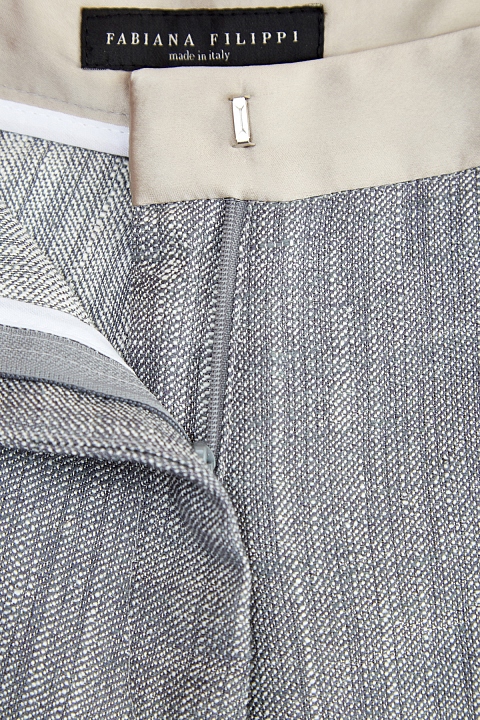 Расклешенные от бедра брюки от Fabiana Filippi выполнены из шелка и льна с переплетенными нитями серо-голубых и белых тонов, которые создают меланжевый эффект по поверхности. Контрастные акценты вносят пояс и лампасы из атласа золотистого оттенка. Высокая линия талии формирует гармоничный силуэт. Детали: потайная застежка, диагональные карманы по бокам. Сделано в Италии.