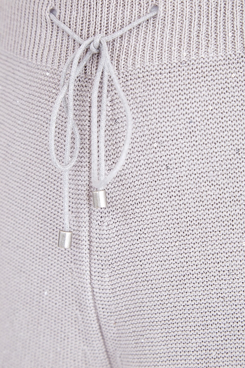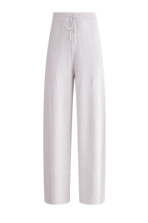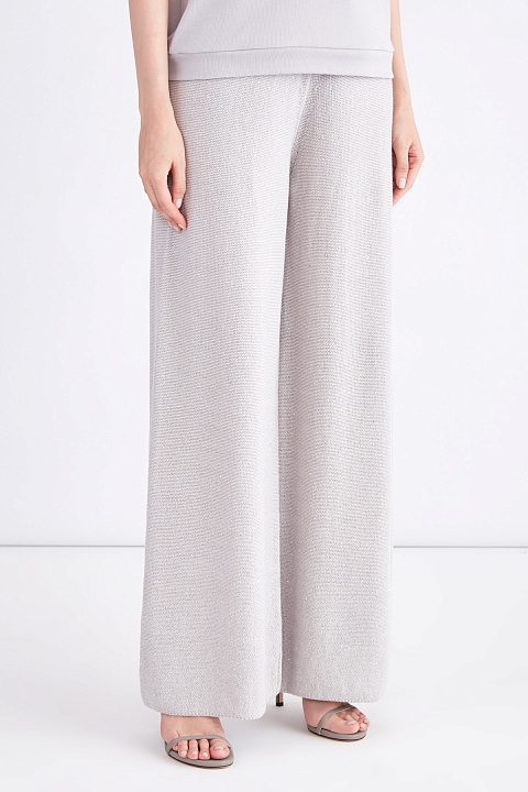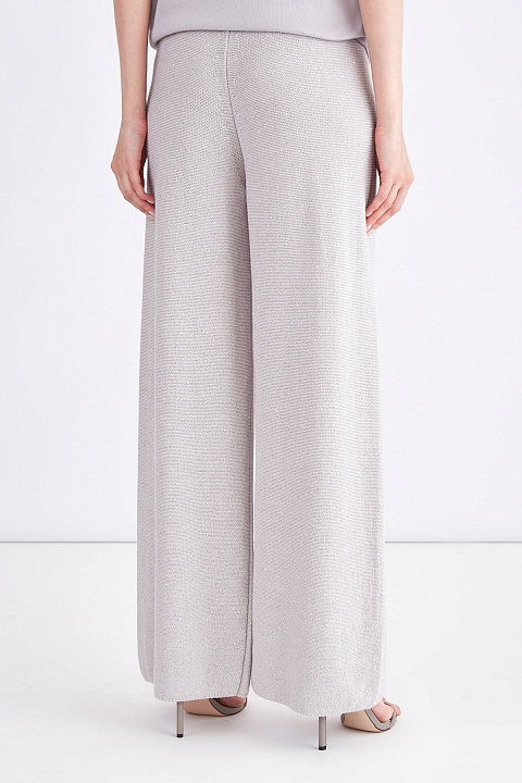 Эффектные трикотажные женские брюки из весенне-летней коллекции Fabiana Filippi выполнены из мягкой пряжи в составе хлопка и льна в светлом жемчужно-сером оттенке. Модель дополнена вплетенными пайетками, которые придают ткани нежное мерцание. Изделие с длинными брючинами широкого кроя и посадкой на завышенной линии талии, оформленной широким эластичным поясом с регулировочным шнурком. Сделано в Италии.
