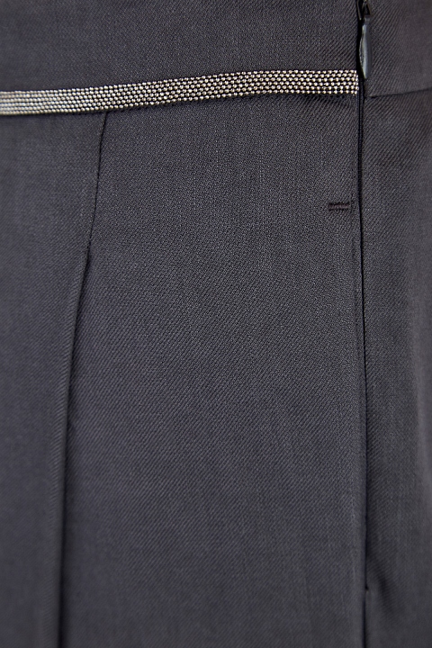Лаконичные брюки от Fabiana Filippi полностью выполнены из держащей форму ткани батавия на основе льна и хлопка. Модель в графитово-сером оттенке дополнена заложенными складками, а высокая линия талии вручную расшита мерцающими цепочками ювелирной огранки. Детали: эластичная вставка на спинке, центральный шов в классическом стиле. Сделано в Италии.