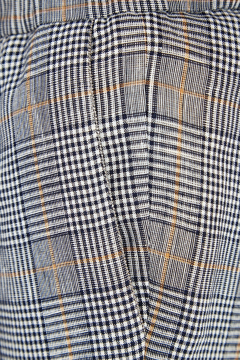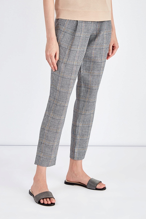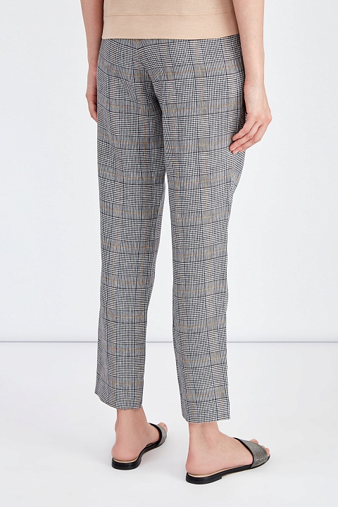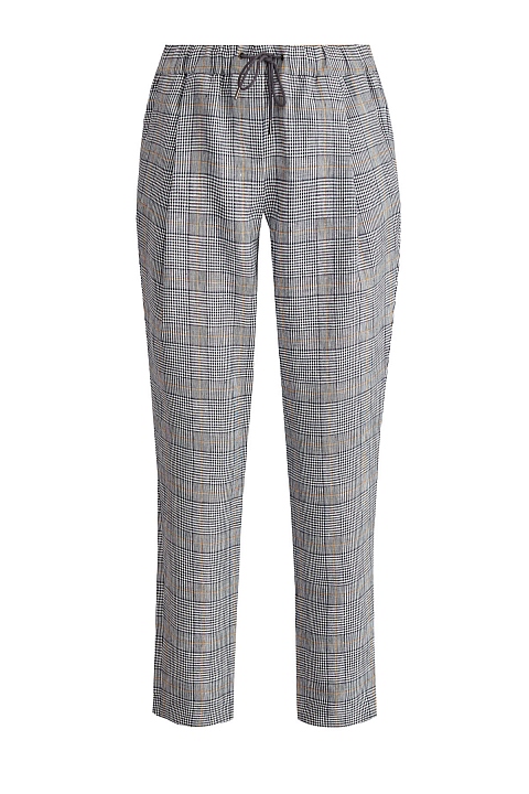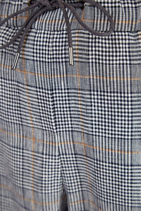 Льняные брюки в клетку с поясом на кулиске и заложенными складками