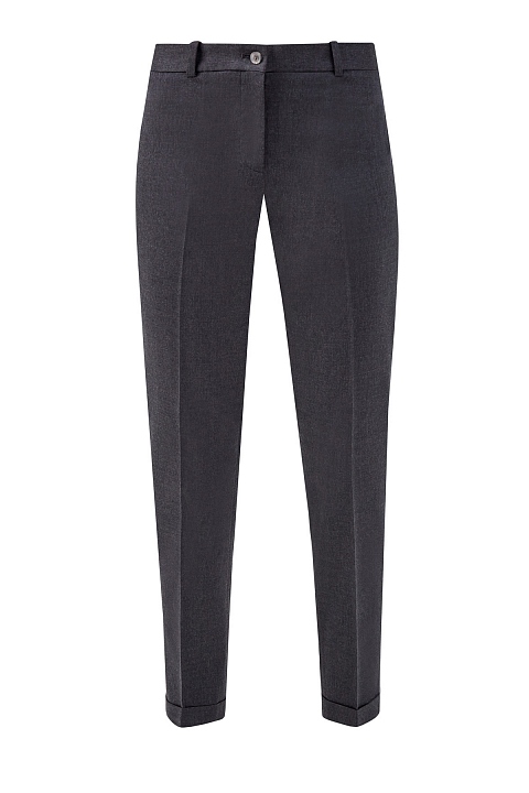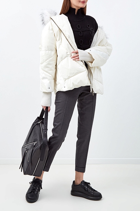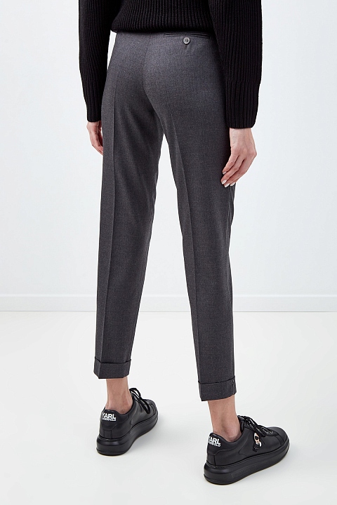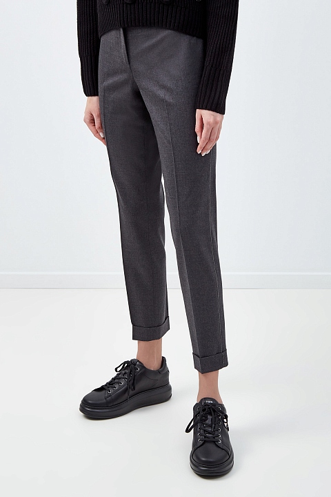 Зауженные брюки в стиле минимализм от Fabiana Filippi выполнены из костюмной шерстяной ткани в мягком жемчужно-сером оттенке. Изящный акцент — лампасы из сверкающей цепочки по боковым швам. Отвороты визуально структурируют силуэт. Детали: средняя посадка, застежка на пуговицу и молнию, вытачки на спинке для посадки по фигуре. Сделано в Италии.