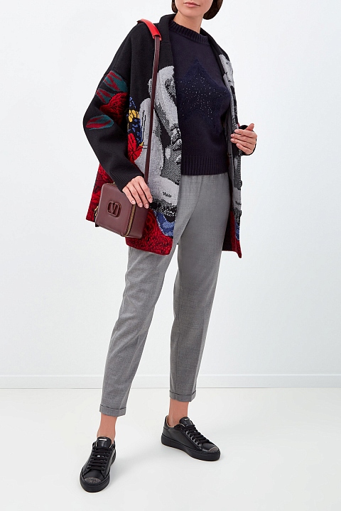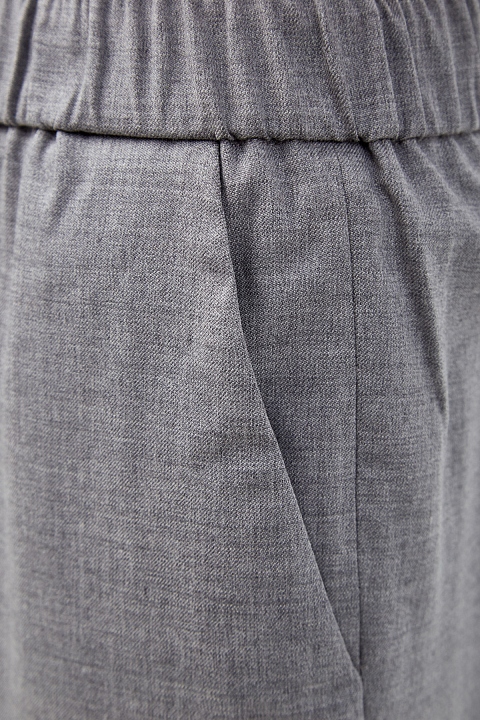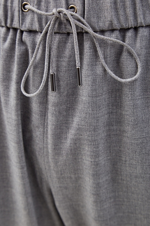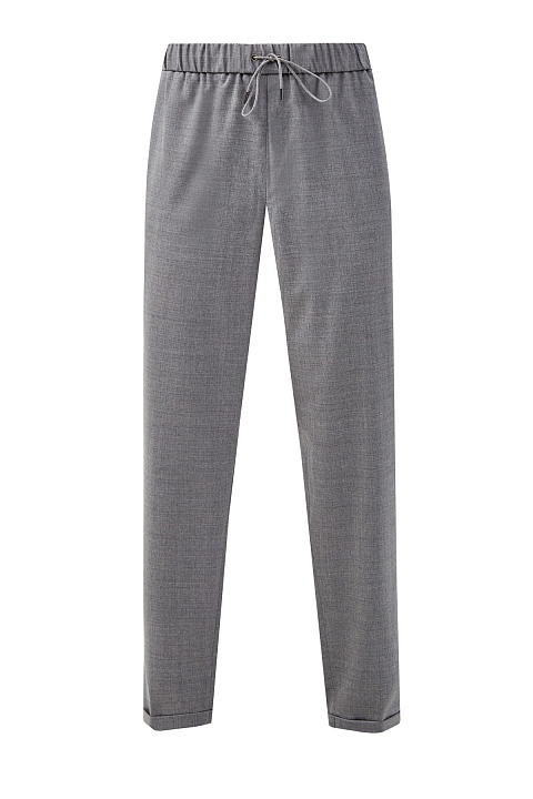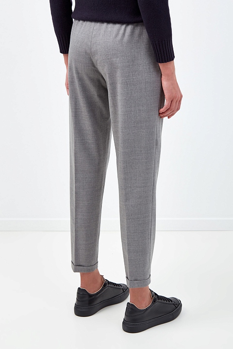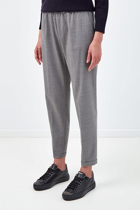 Элегантные брюки от Fabiana Filippi созданы из струящейся шерстяной ткани в благородном жемчужно-сером оттенке. Благодаря синтетическим волокнам в составе ткань не стесняет движений. Эластичный пояс на кулиске обеспечивает комфортную посадку и подчеркивает расслабленный стиль модели, отвороты структурируют силуэт. Детали: прорезные карманы по бокам, укороченный зауженный крой. Сделано в Италии.