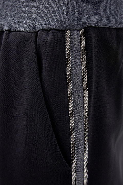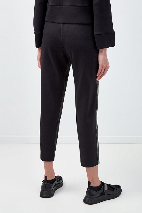Спортивные брюки от Fabiana Filippi выполнены из технического джерси в черном цвете. Ткань на основе хлопка дышит и не стесняет движений, синтетические волокна в составе препятствуют образованию складок. Контрастный пояс в рубчик сочетается с лампасами, а отделка сверкающим цепочками вносит в образ фирменный штрих. Детали: прорезные карманы, укороченный силуэт. Сделано в Италии.