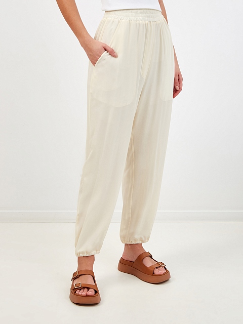 Элегантные брюки свободного укороченного кроя от Gentryportofino выполнены в кремовом оттенке. Модель из тонкого струящегося шелка идеально подходит для создания повседневных и вечерних образов. Широкий эластичный пояс и манжеты в резинку обеспечивает комфортную посадку по фигуре, прорезные карманы завершают минималистичный дизайн. Сделано в Италии.