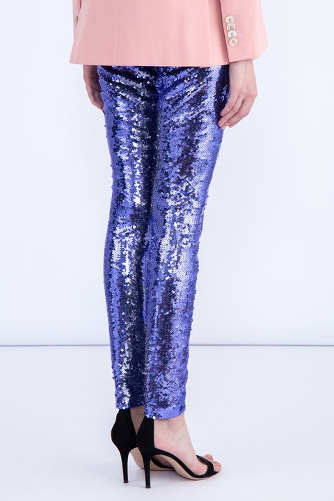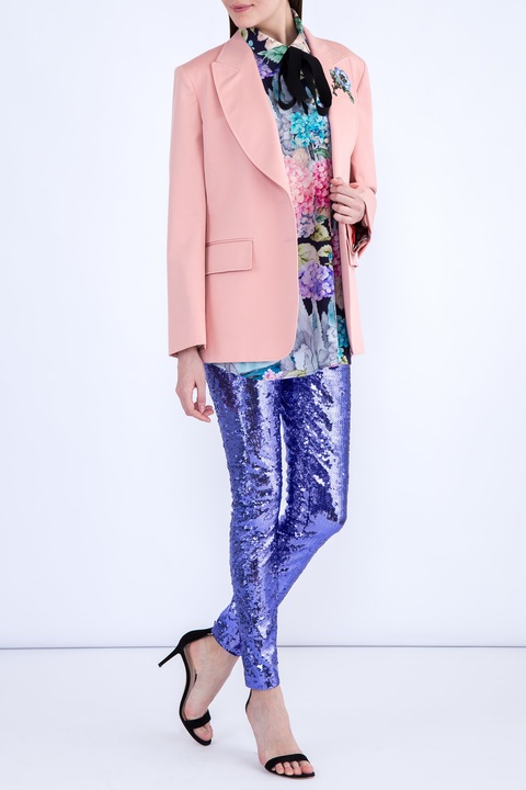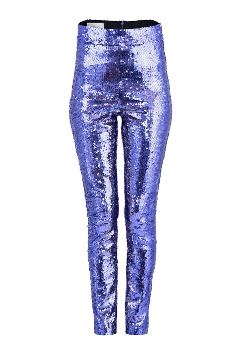Яркие женские леггинсы Gucci облегающего кроя в стиле диско, выполненные из эластичной ткани, расшитой переливающимися пайетками фиолетового тона. Модель с завышенной посадкой на талии на широком притачном поясе с потайной застежкой-молнией в центральном шве спинки. Сделано в Италии.