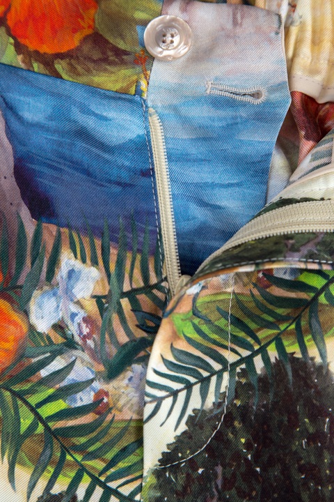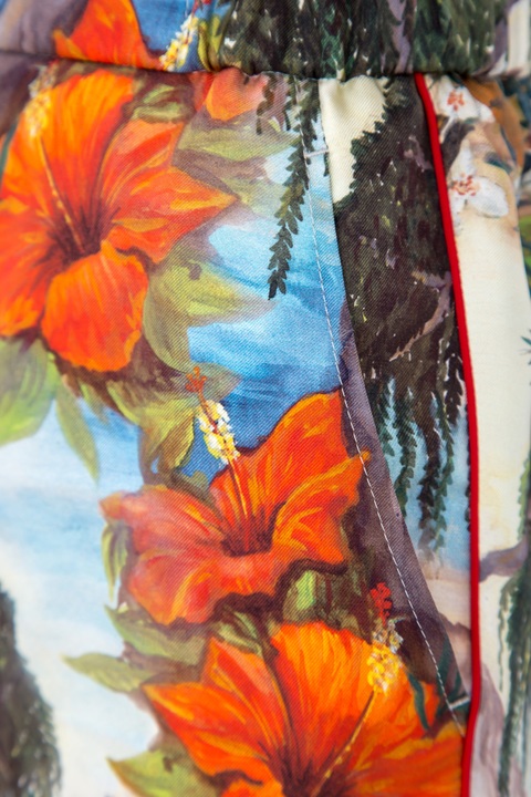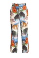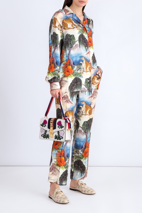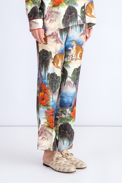 Изящные укороченные женские брюки из весенне-летней коллекции Gucci выполнены из струящегося шелка с ярким набивным принтом с тропическим мотивом. Свободный крой и отделка боковых швов тесьмой знакового для бренда алого тона создает ассоциацию с актуальным пижамным стилем. Модель оснащена притачным поясом с комфортной широкой резинкой на спинке, двумя прорезными карманами, а также застежкой на пуговицу и молнию. Сделано в Италии.