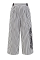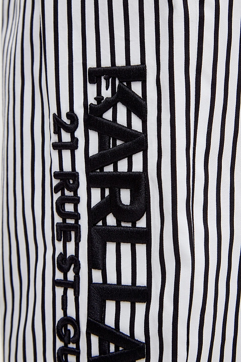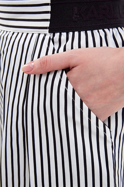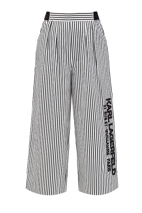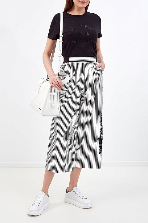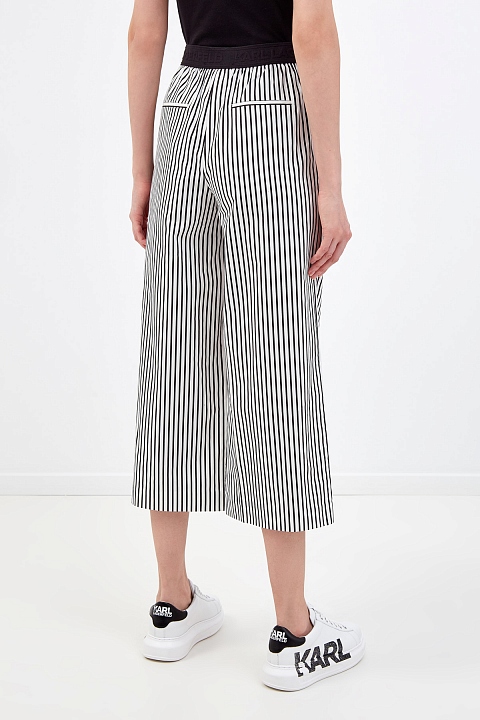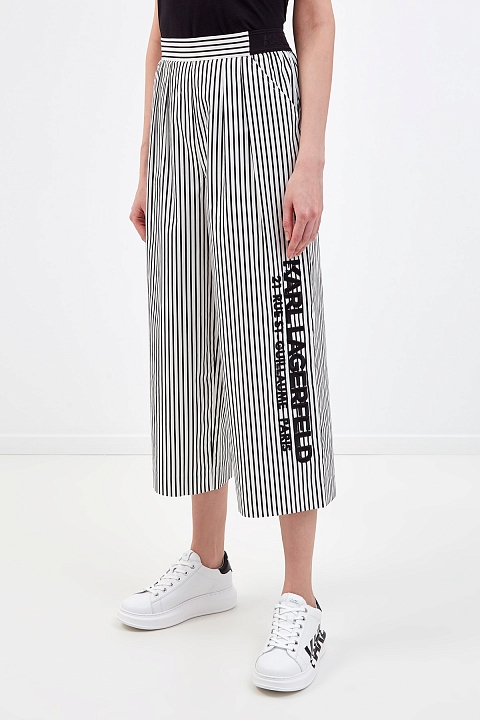 Укороченные кюлоты от Karl Lagerfeld выполнены из тонкого хлопка. Принт в узкую черно-белую полоску визуально вытягивает силуэт. Стильный акцент — объемная аппликация с принтом Rue St-Guillaume. Комфортную посадку обеспечивают эластичные вставки по бокам. Детали: прорезные диагональные карманы, заложенные от пояса складки.