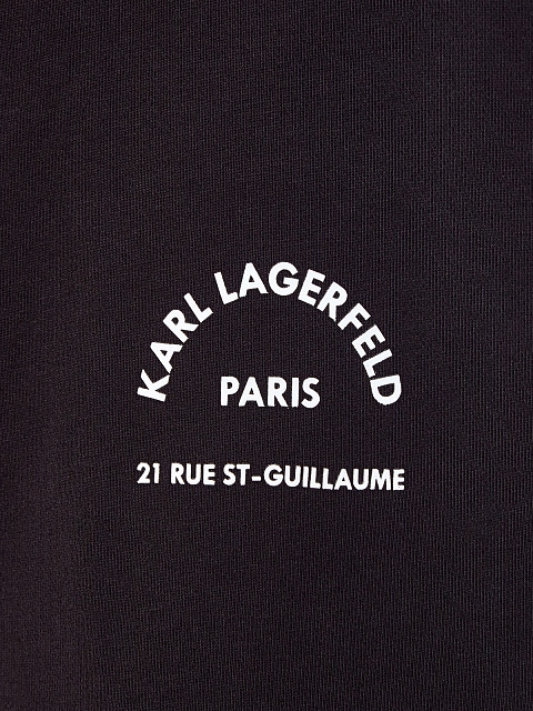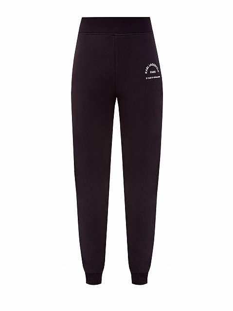 Спортивные брюки-джоггеры от Karl Lagerfeld представлены в черном цвете. Модель выполнена из хлопкового футера — эластичной и дышащей ткани с фактурной внутренней поверхностью. Минималистичный дизайн дополнен контрастной аппликацией с логотипом бренда. Детали: широкие манжеты и пояс в тон, прорезные карманы.