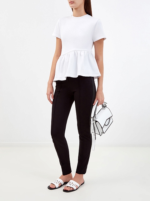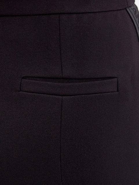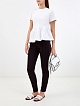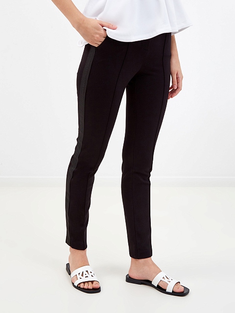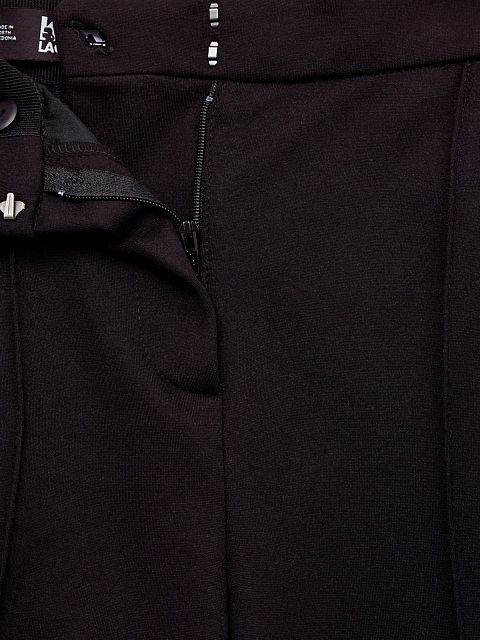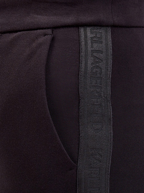 Женские брюки в стиле спортшик от Karl Lagerfeld. Модель создана в фирменном черном цвете из эластичной и прочной вискозы, лента-грогрен с логотипом бренда на боковых планках визуально вытягивает силуэт. Прорезные карманы и объемные швы завершают минималистичный дизайн. Детали: облегающий крой, застежка на молнию и крючок, потайная пуговица на поясе.