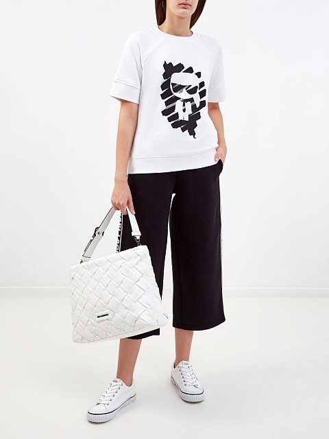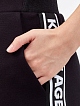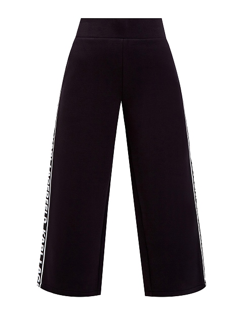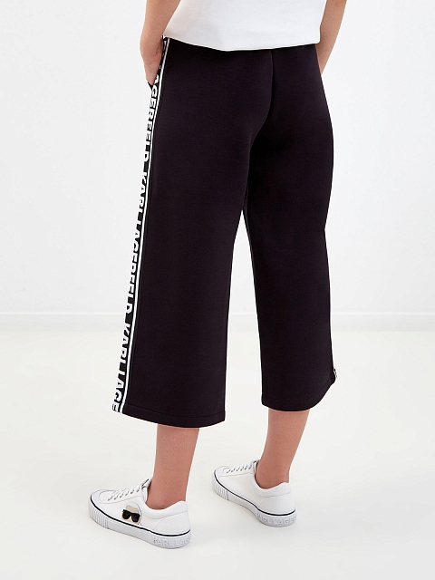 Кюлоты от Karl Lagerfeld выполнены из вискозного джерси — дышащей и держащей форму ткани. Модель представлена в культовом черном цвете и дополнена лампасами с контрастной жаккардовой монограммой Модного дома. Пояс с эластичными вставками обеспечивает максимальный комфорт, а прорезные карманы делают дизайн еще более универсальным.