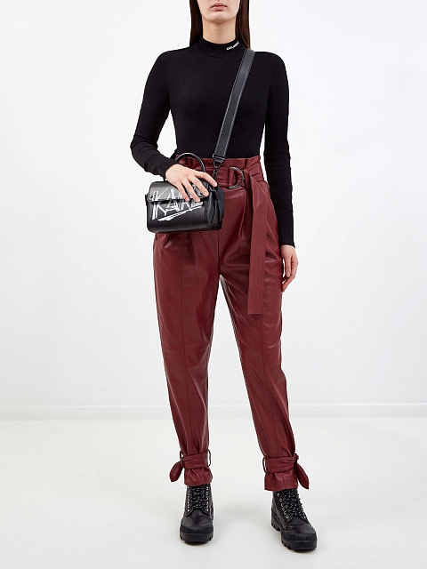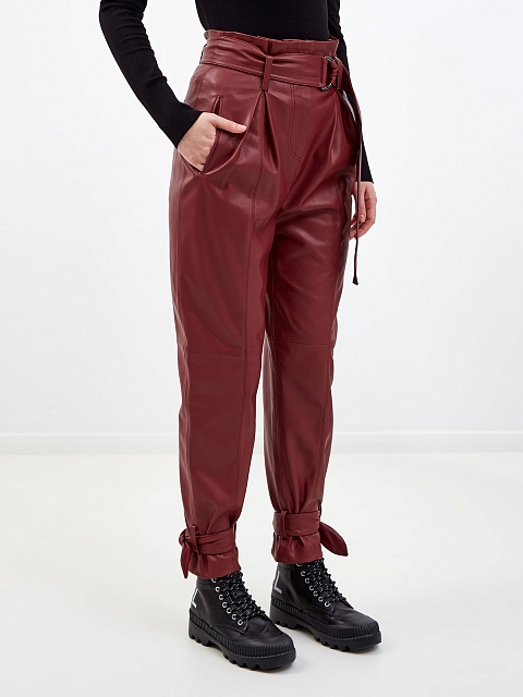 Высокие брюки из эко-кожи с широким поясом и завязками