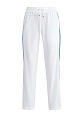 Укороченные широкие брюки от Kenzo выполнены из струящегося крепа, воздушная ткань придает элементу спортивного гардероба нотку элегантности. Модель молочно-белого оттенка дополнена широкими контрастными лампасами по бокам, а также эластичным поясом с кулиской на люверсах.